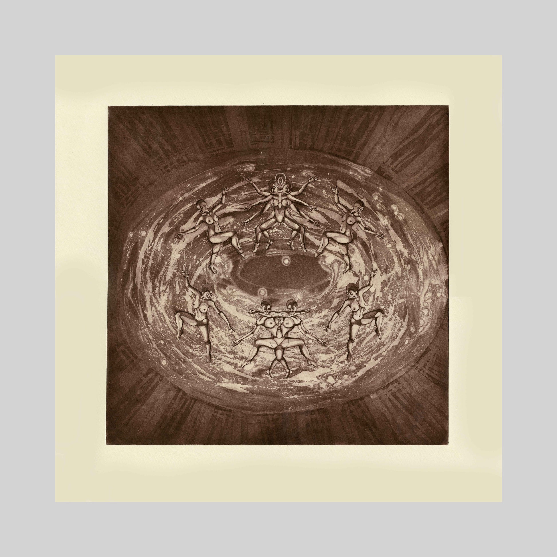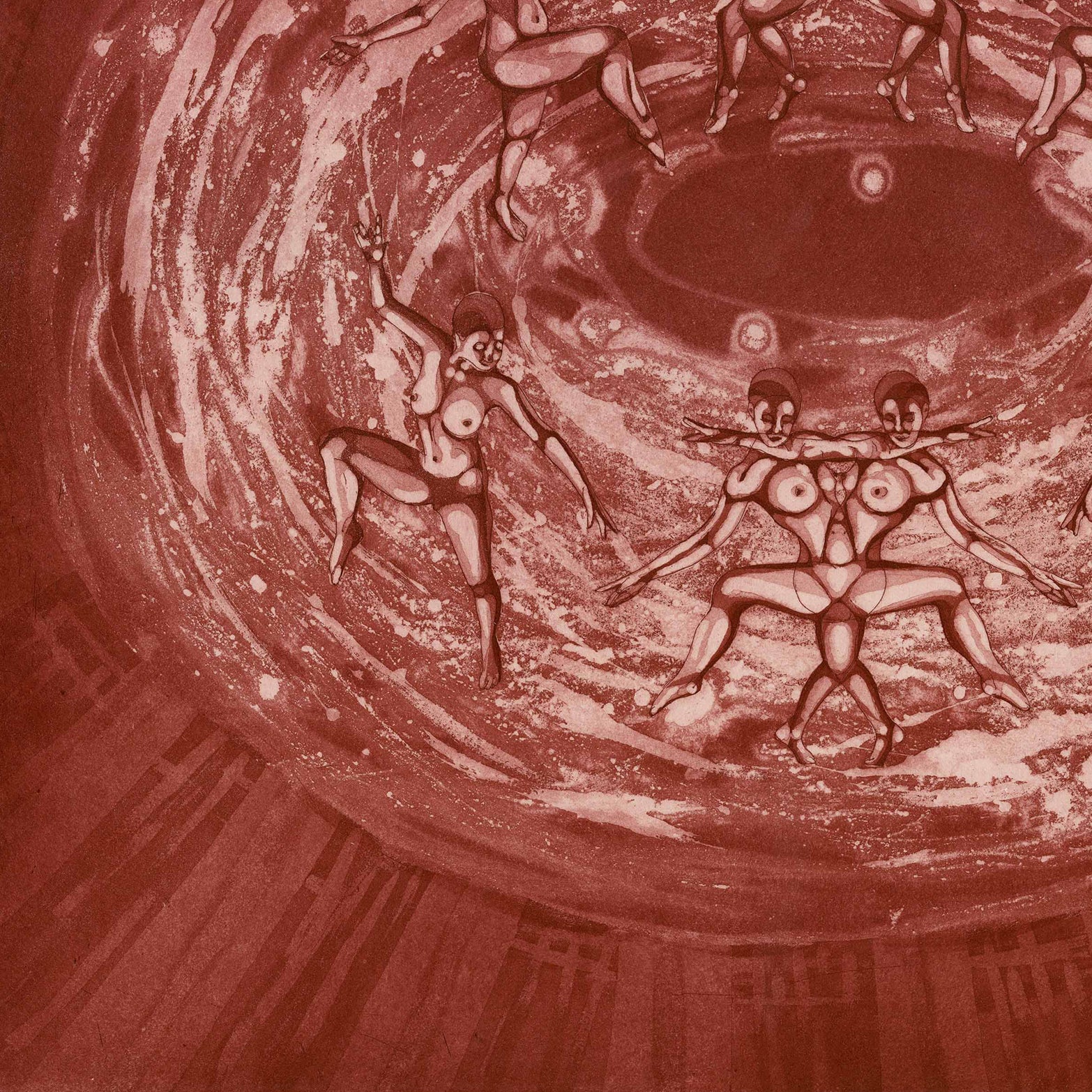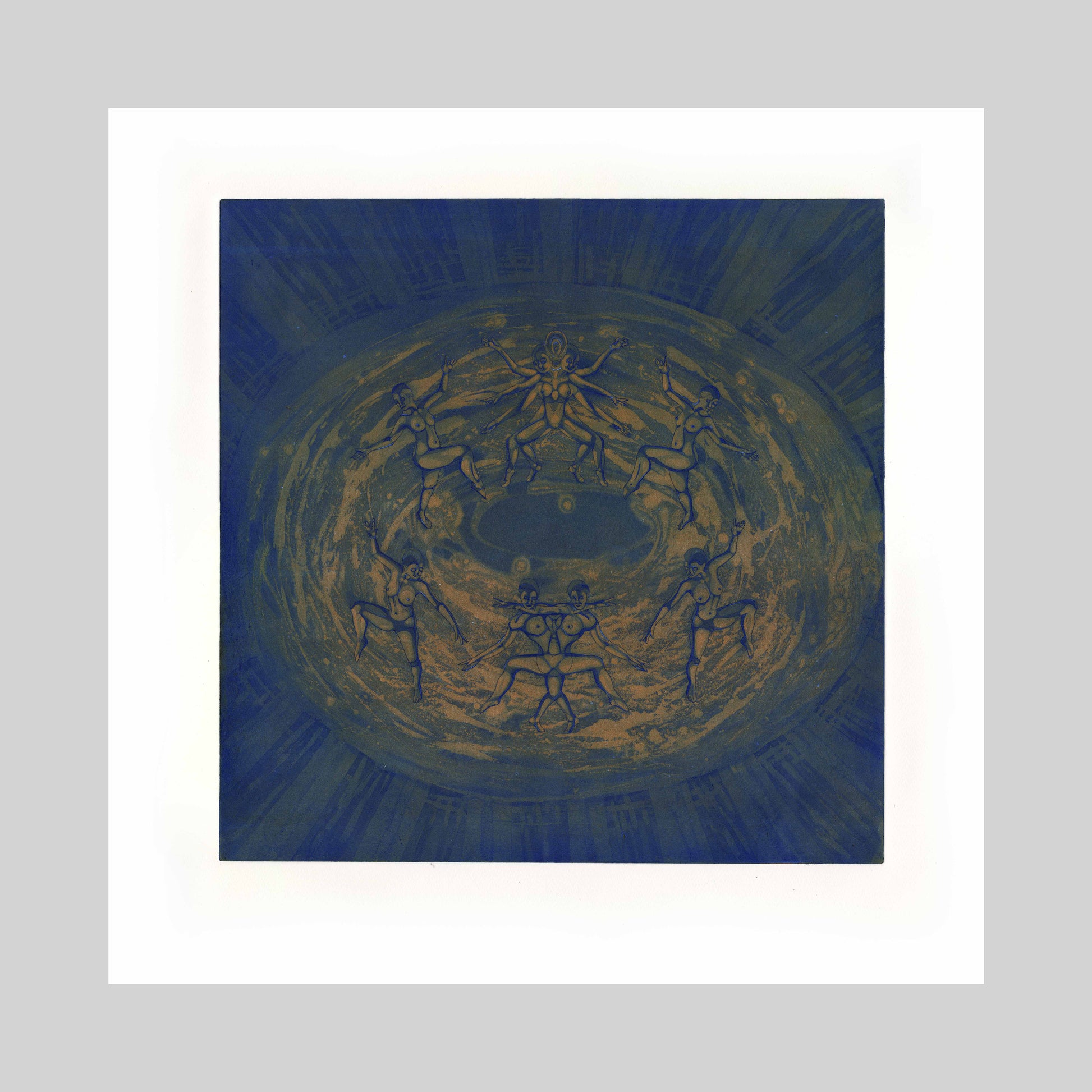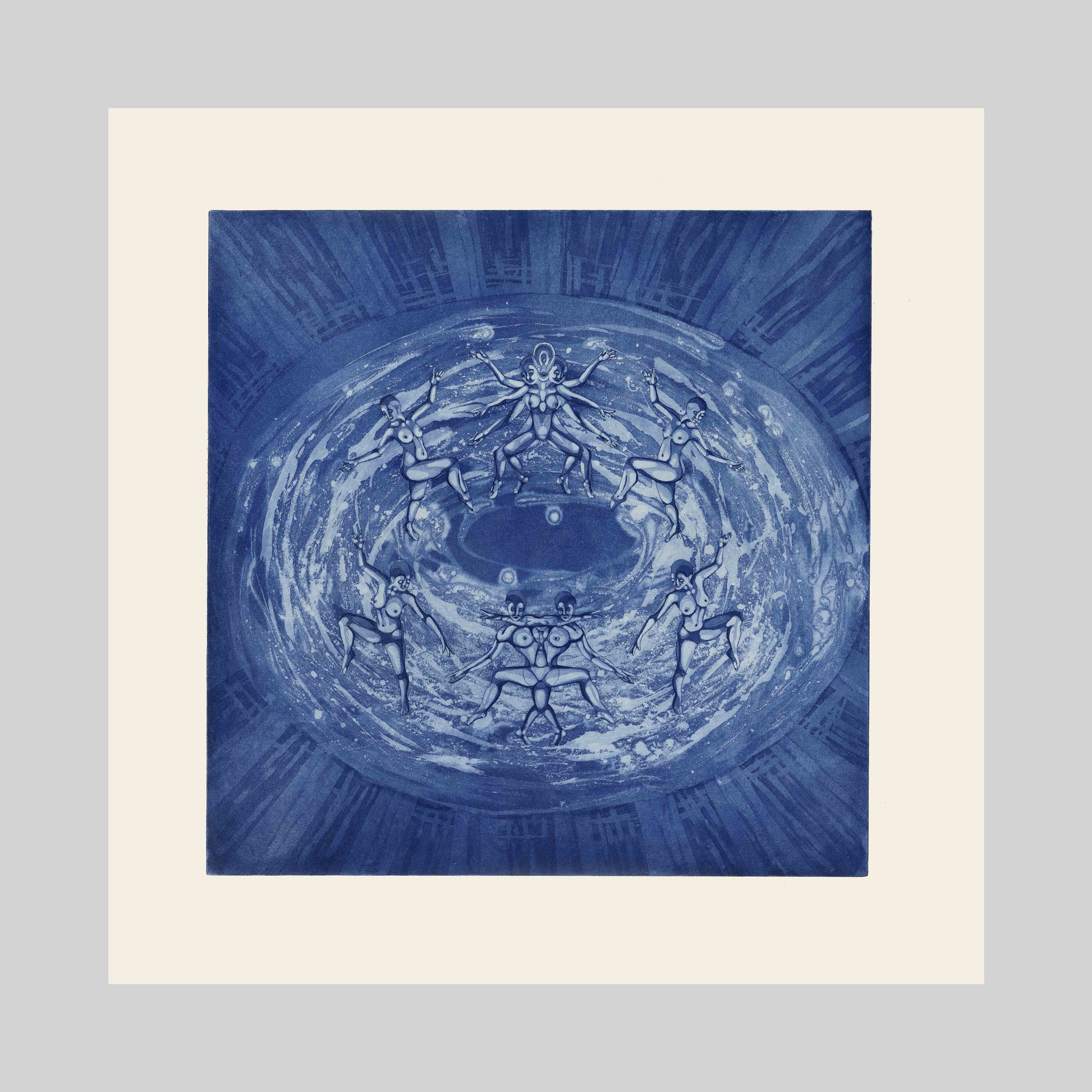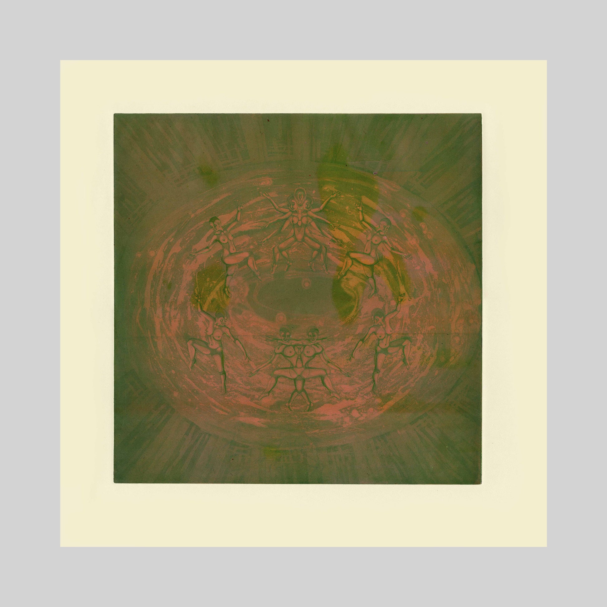 'Bigger than All of Us' is an etching, 50 × 50 cm. The original etching was printed in red, available in an edition of five. The additional prints shown here are unique, one-off variations created through experimentation with colour and viscosity printing—a technique in which the viscosity of the inks is altered and layered so that the colours do not mix, resulting in rich textures and subtle depth.