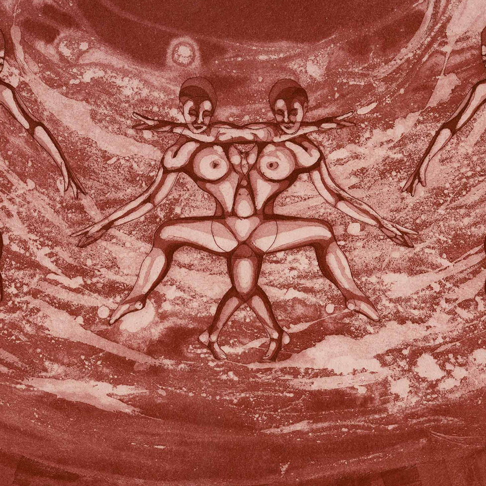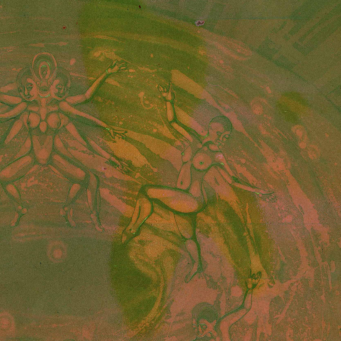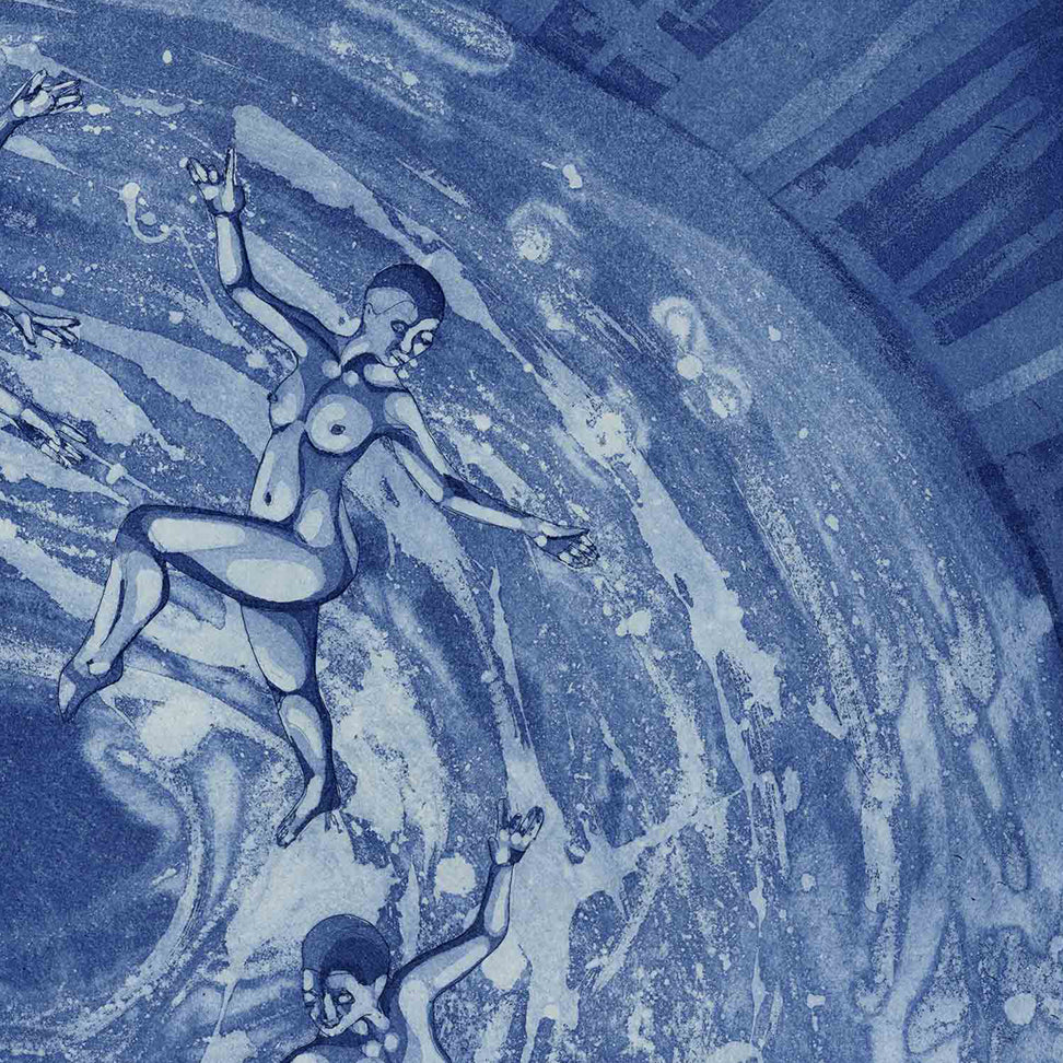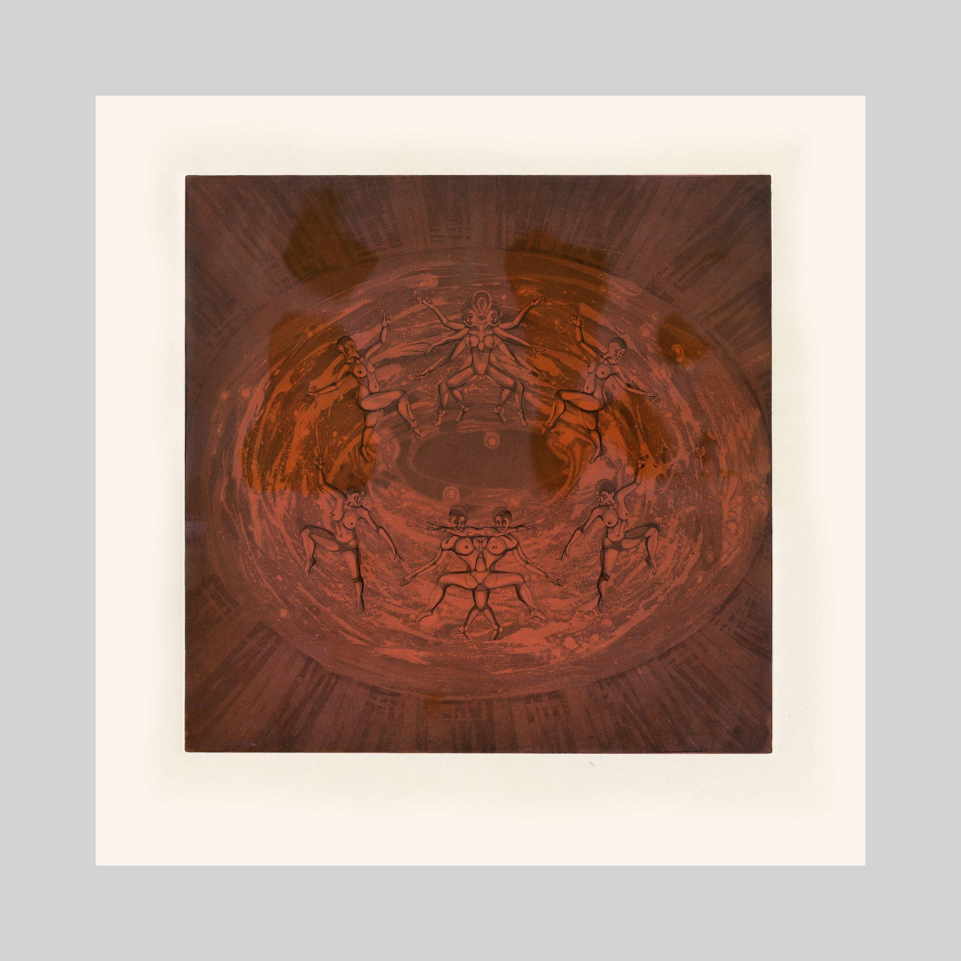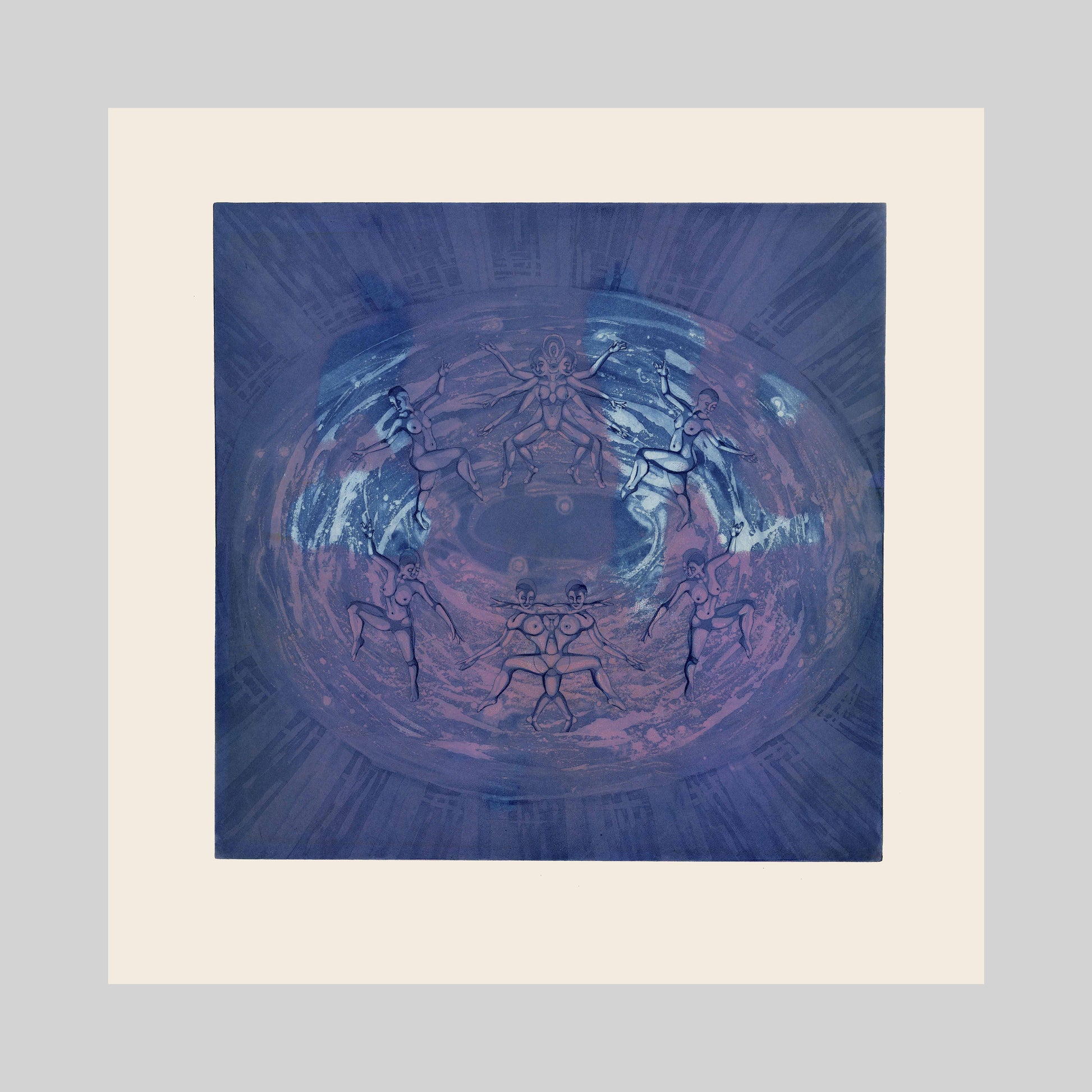 'Bigger than All of Us' is an etching, 50 × 50 cm. The original etching was printed in red, available in an edition of five. The additional prints shown here are unique, one-off variations created through experimentation with colour and viscosity printing—a technique in which the viscosity of the inks is altered and layered so that the colours do not mix, resulting in rich textures and subtle depth.