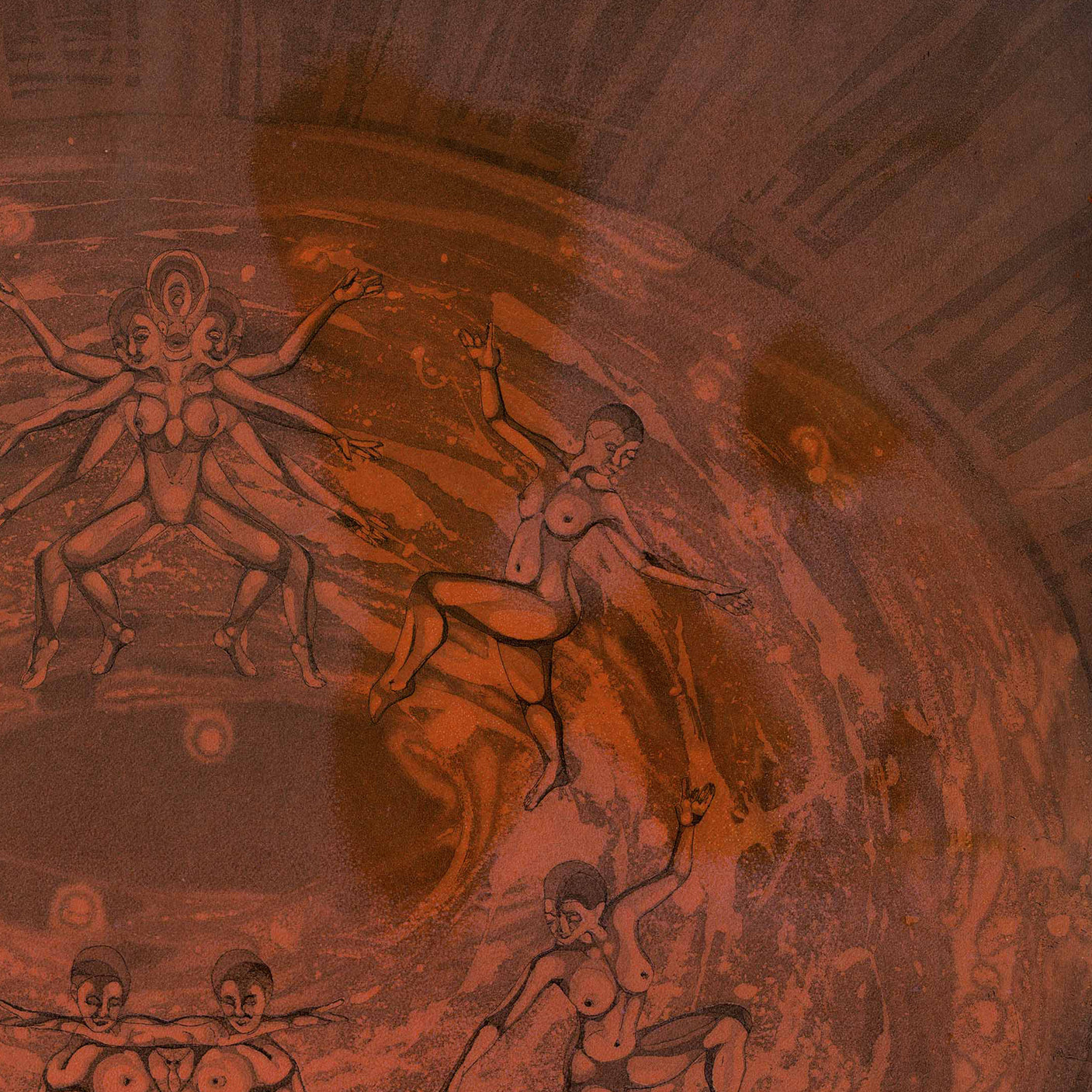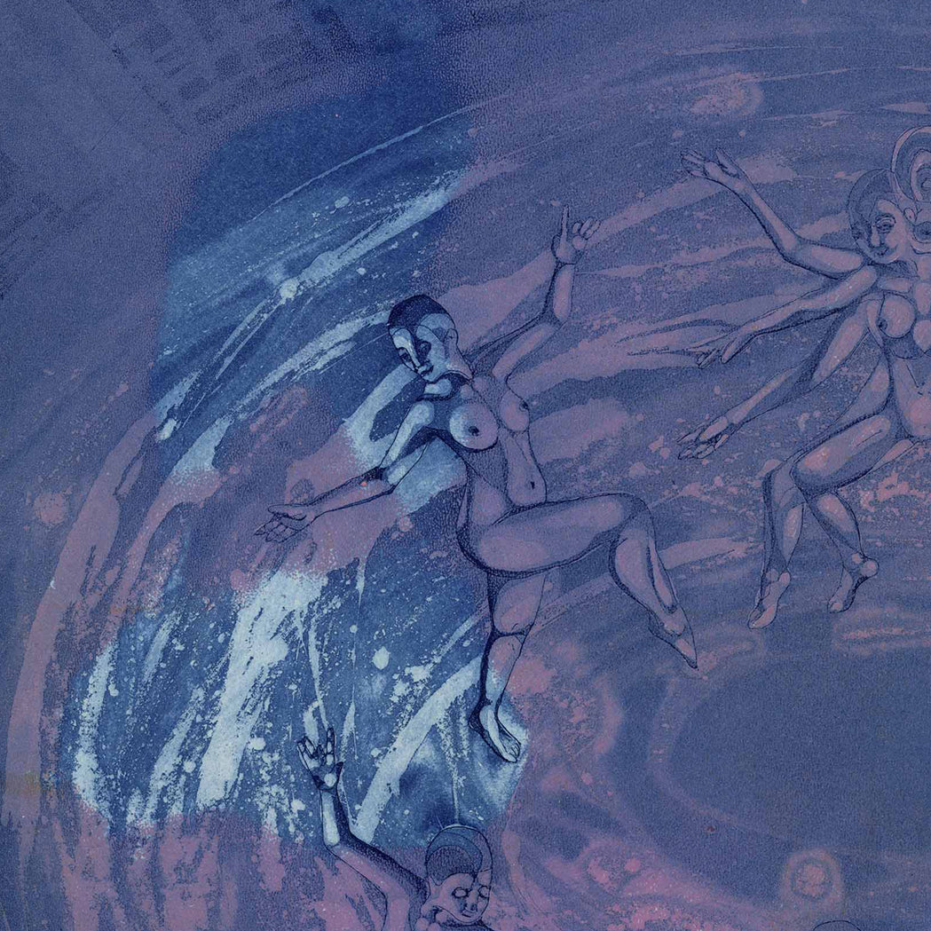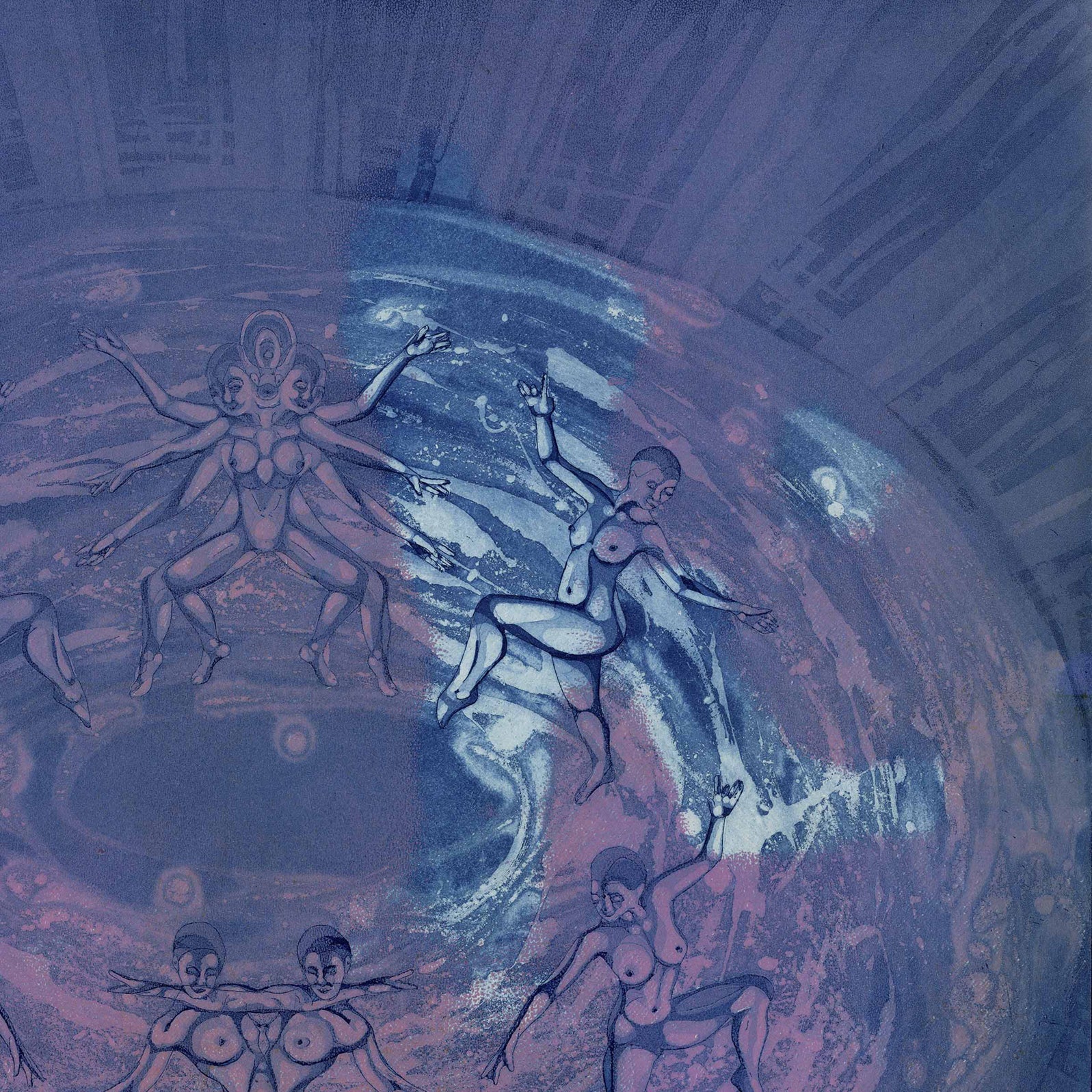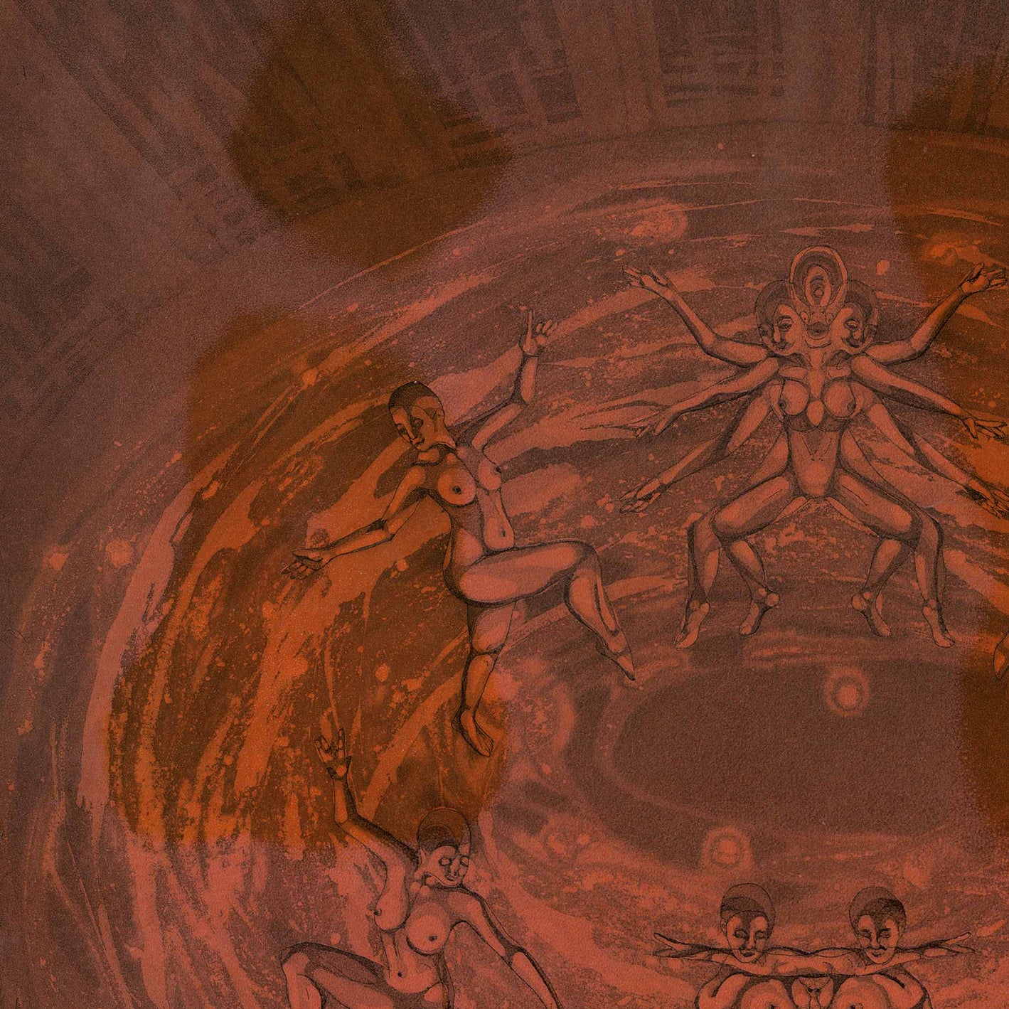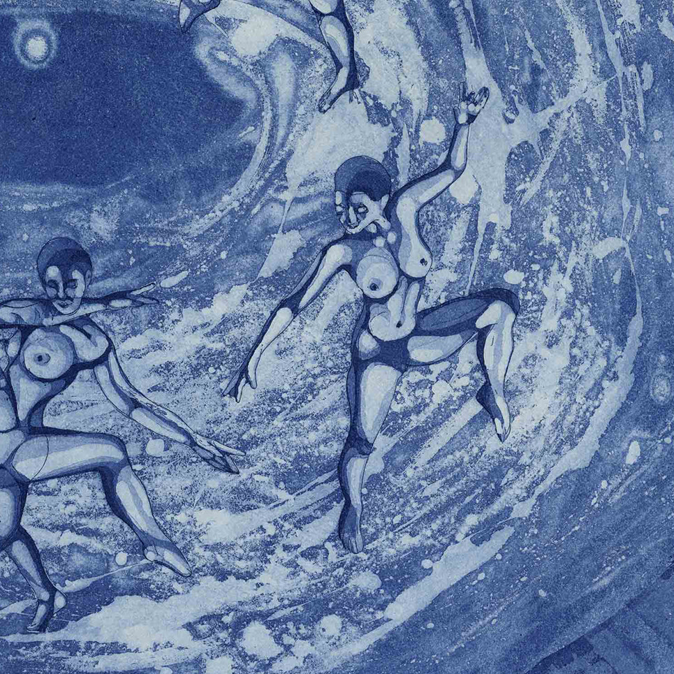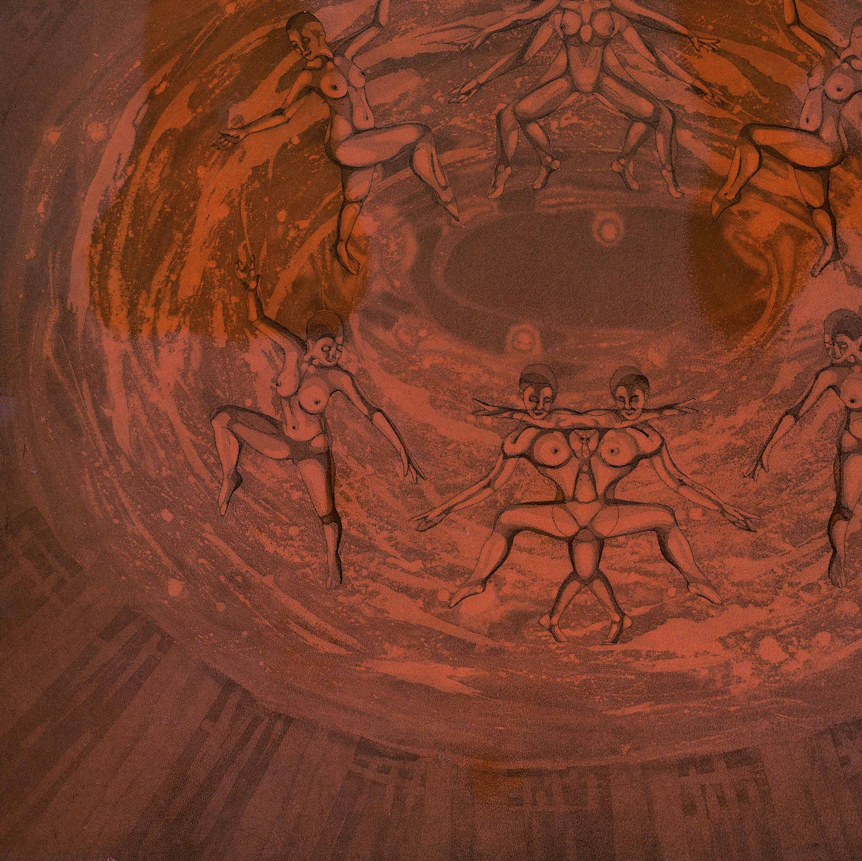 'Bigger than All of Us' is an etching, 50 × 50 cm. The original etching was printed in red, available in an edition of five. The additional prints shown here are unique, one-off variations created through experimentation with colour and viscosity printing—a technique in which the viscosity of the inks is altered and layered so that the colours do not mix, resulting in rich textures and subtle depth.