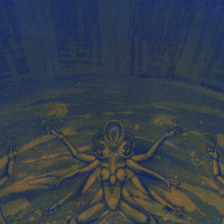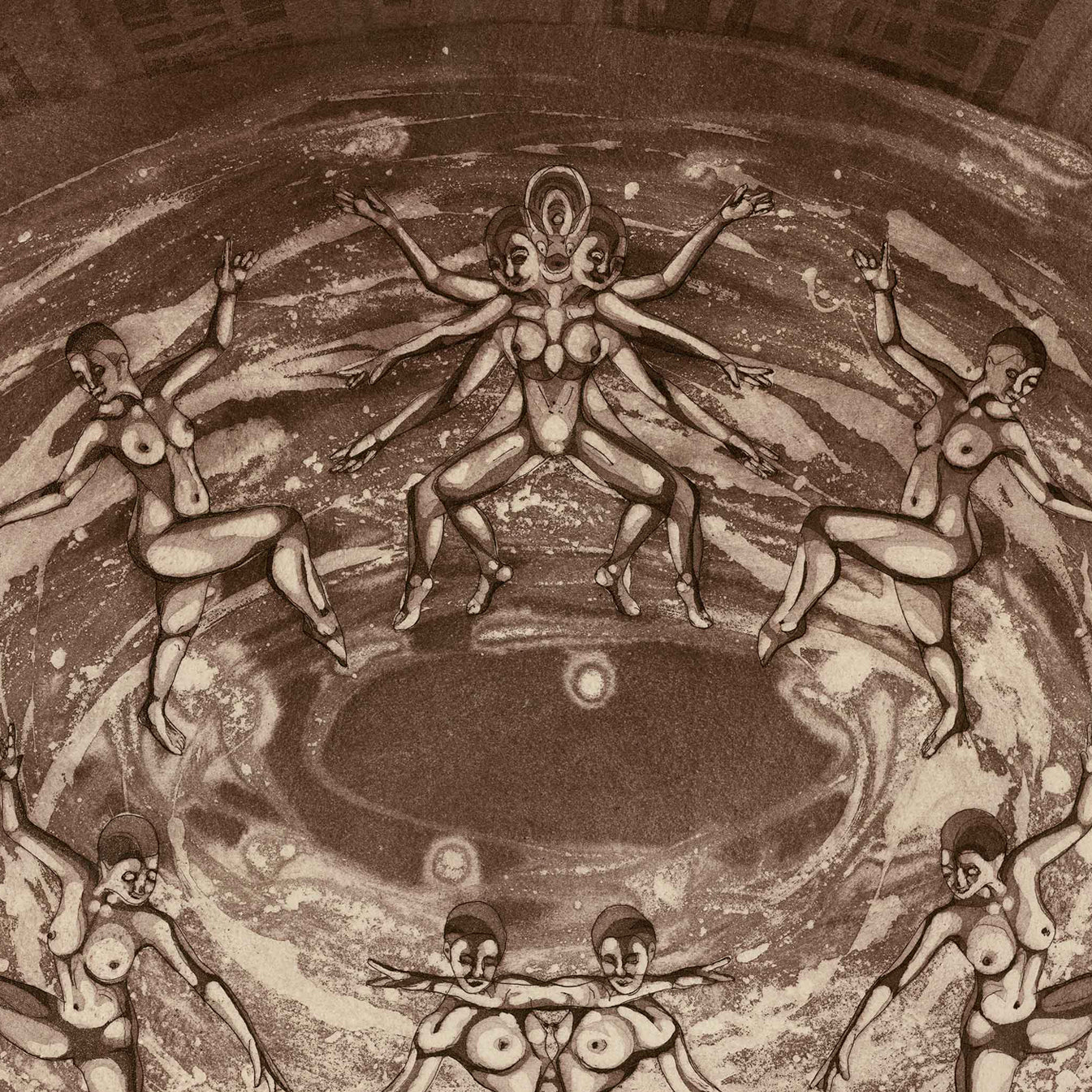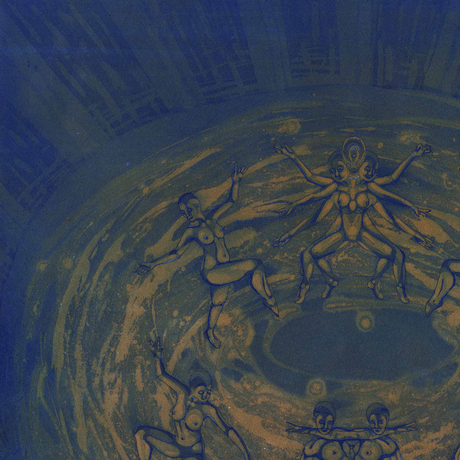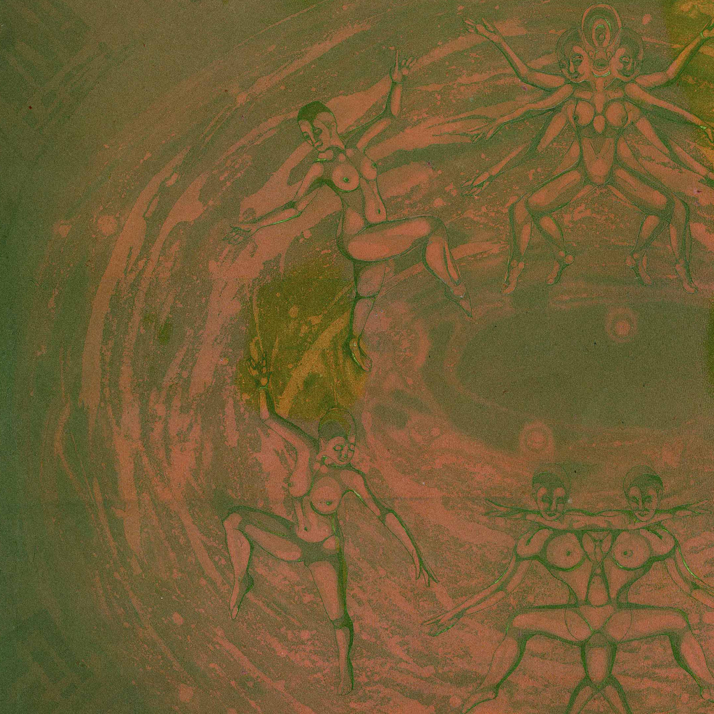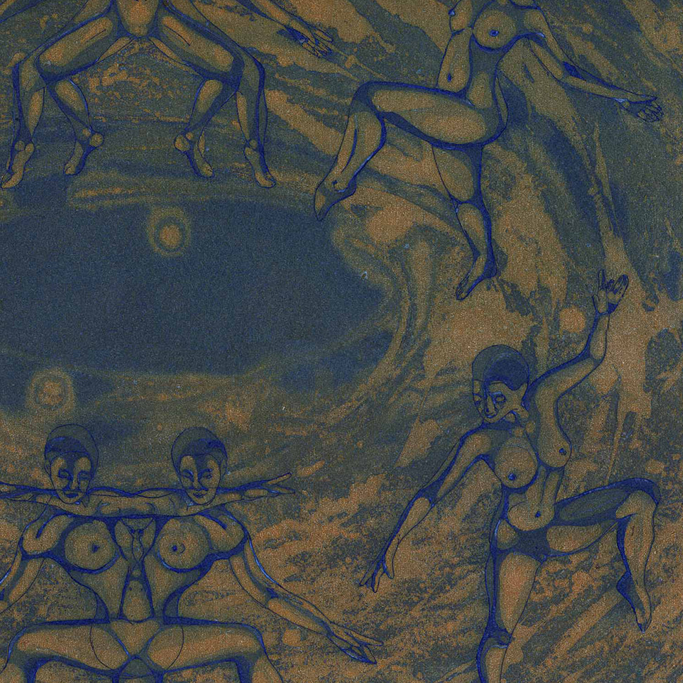 'Bigger than All of Us' is an etching, 50 × 50 cm. The original etching was printed in red, available in an edition of five. The additional prints shown here are unique, one-off variations created through experimentation with colour and viscosity printing—a technique in which the viscosity of the inks is altered and layered so that the colours do not mix, resulting in rich textures and subtle depth.