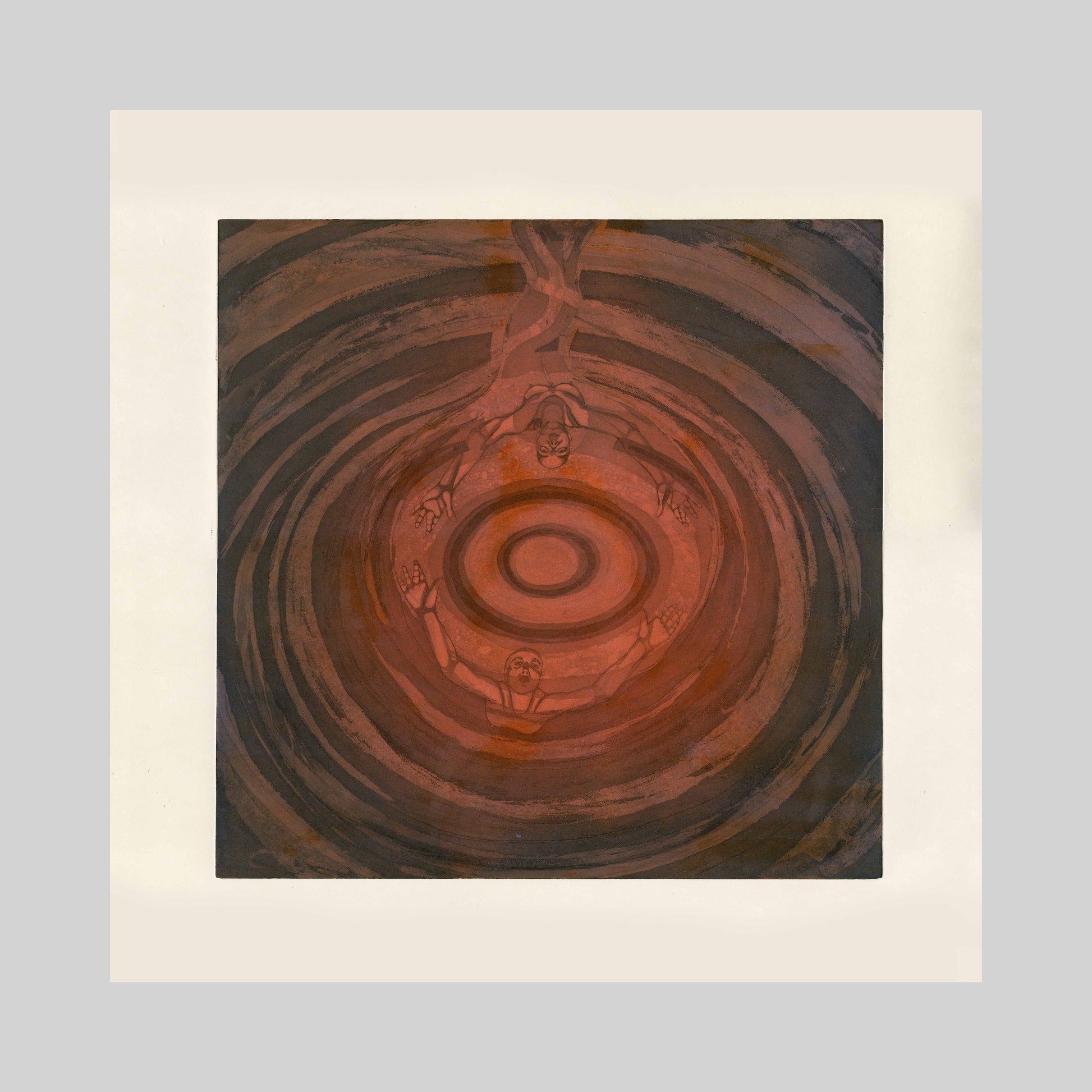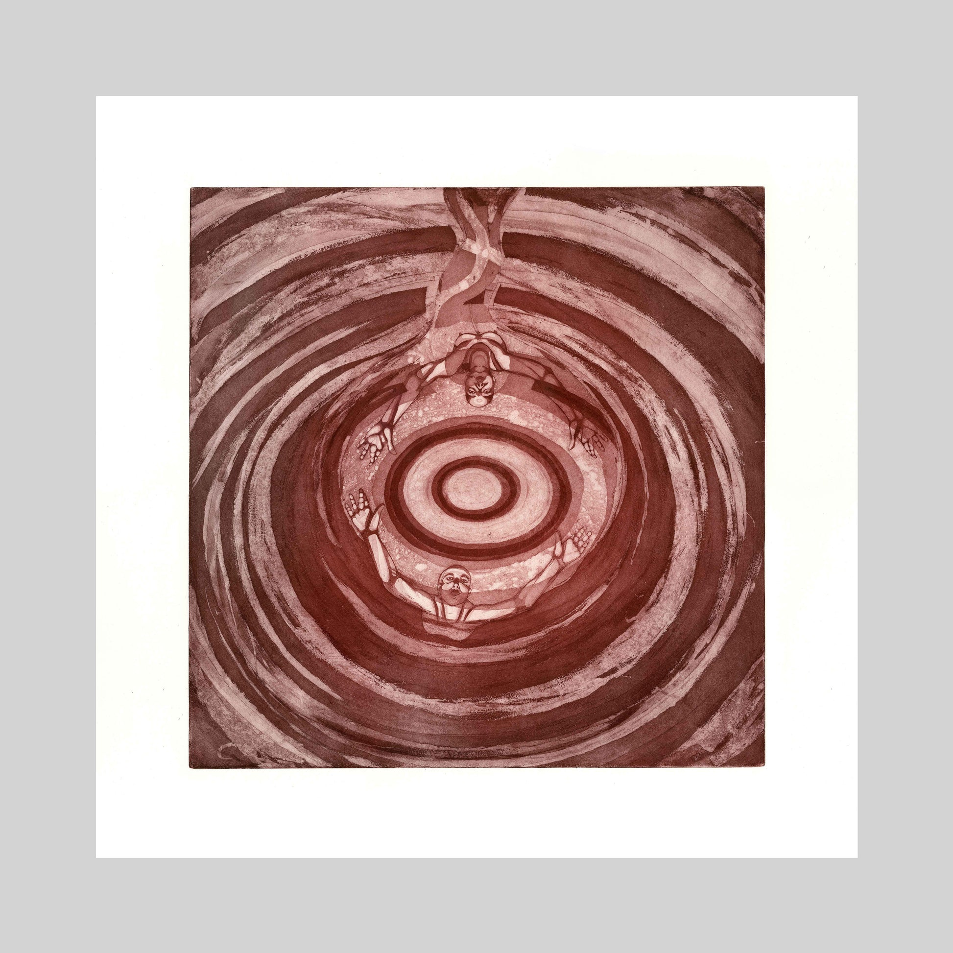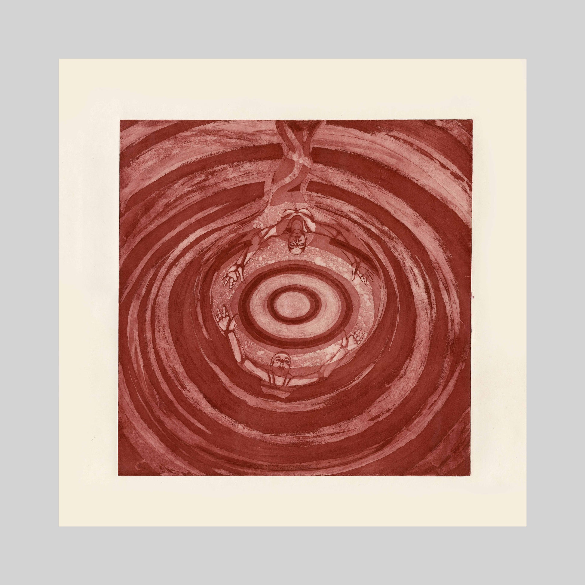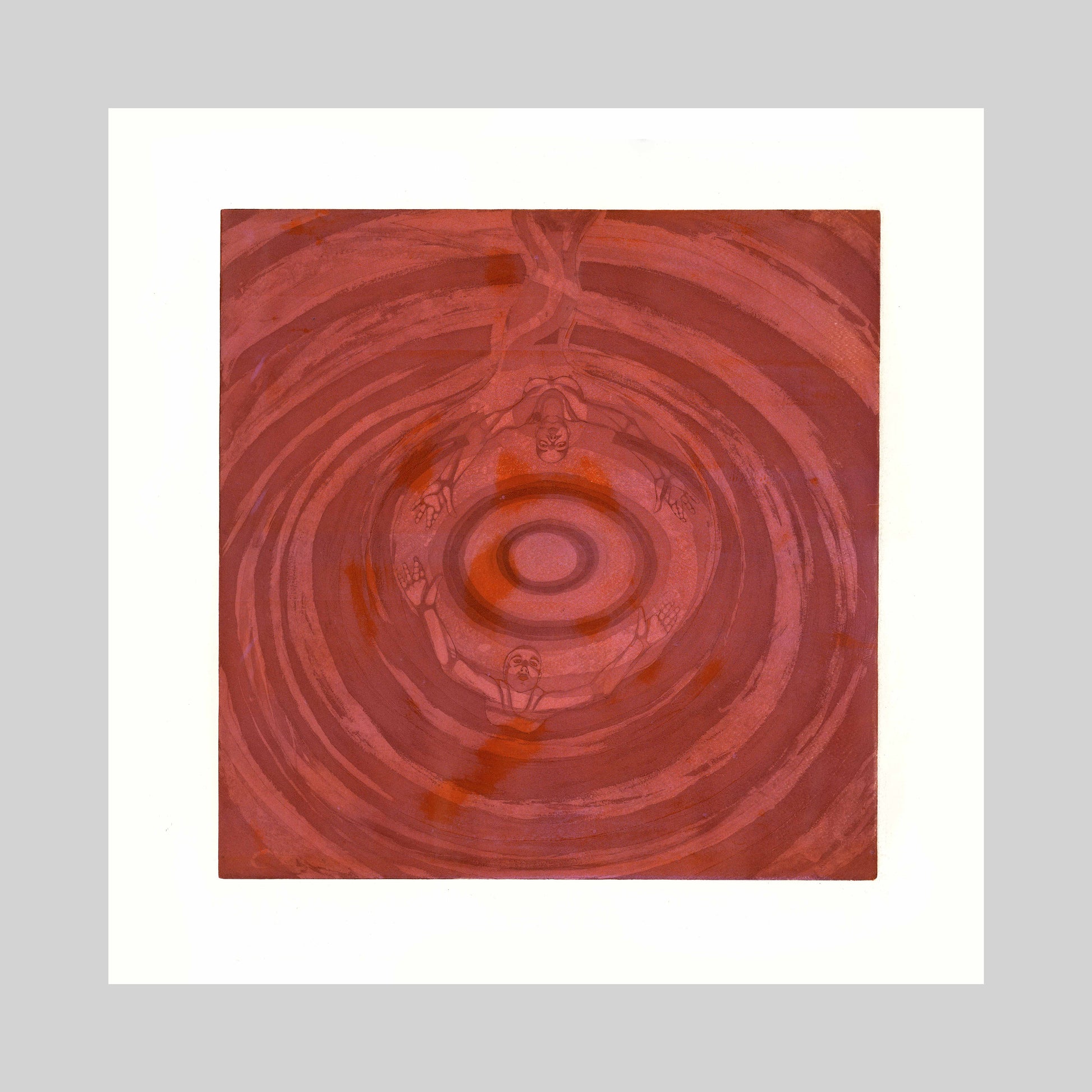 'Bigger than Me' is an etching, 50 × 50 cm. The original etching was printed in red and is available in an edition of five. The additional prints shown here are unique, one-off variations created through experimentation with colour and viscosity printing—a technique in which the viscosity of the inks is adjusted and layered so the colours remain distinct, creating depth and subtle texture.
