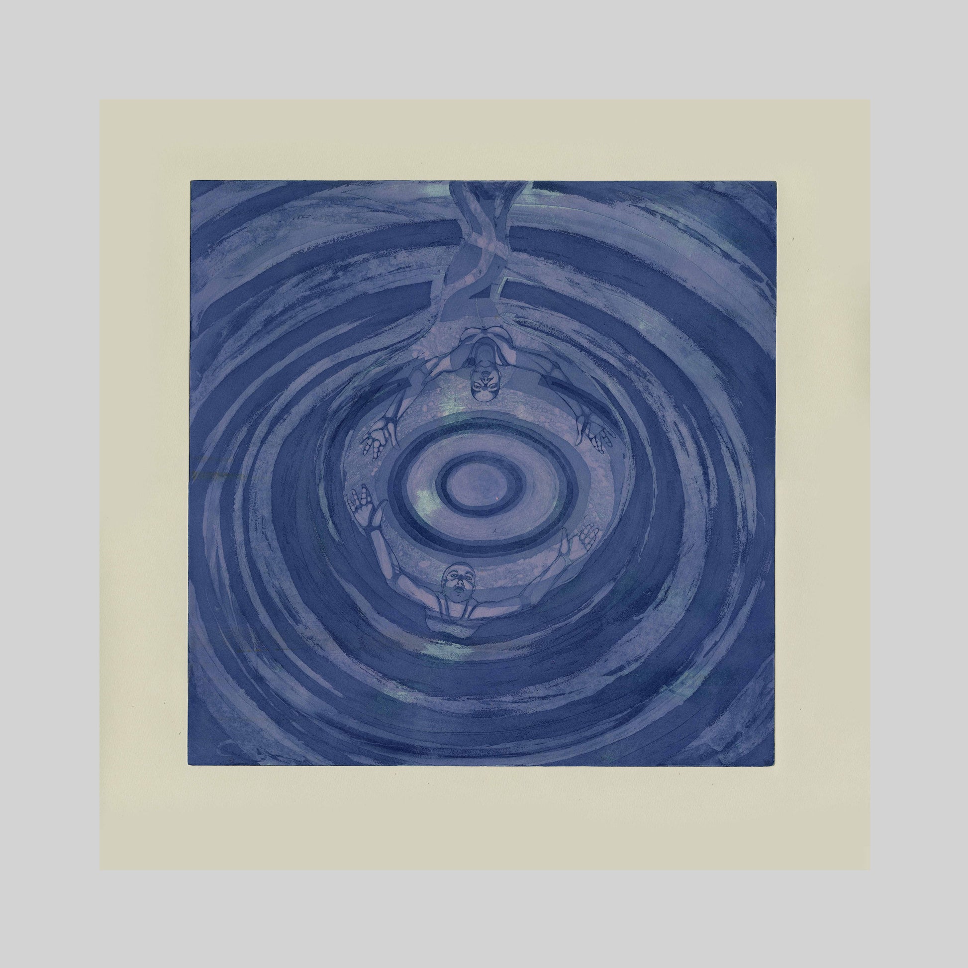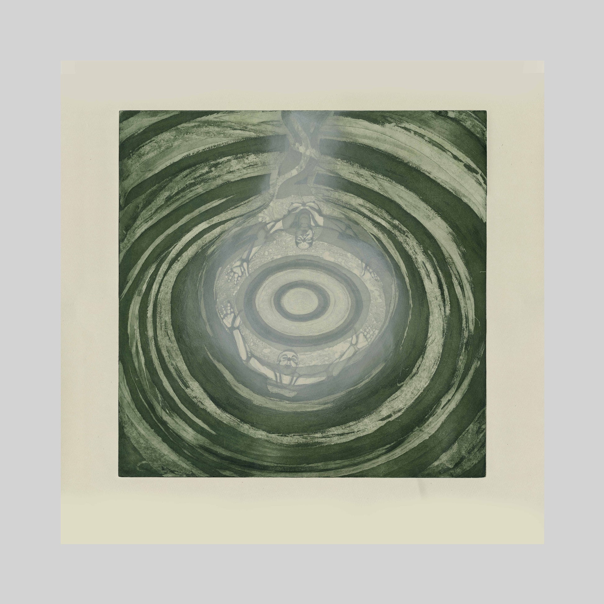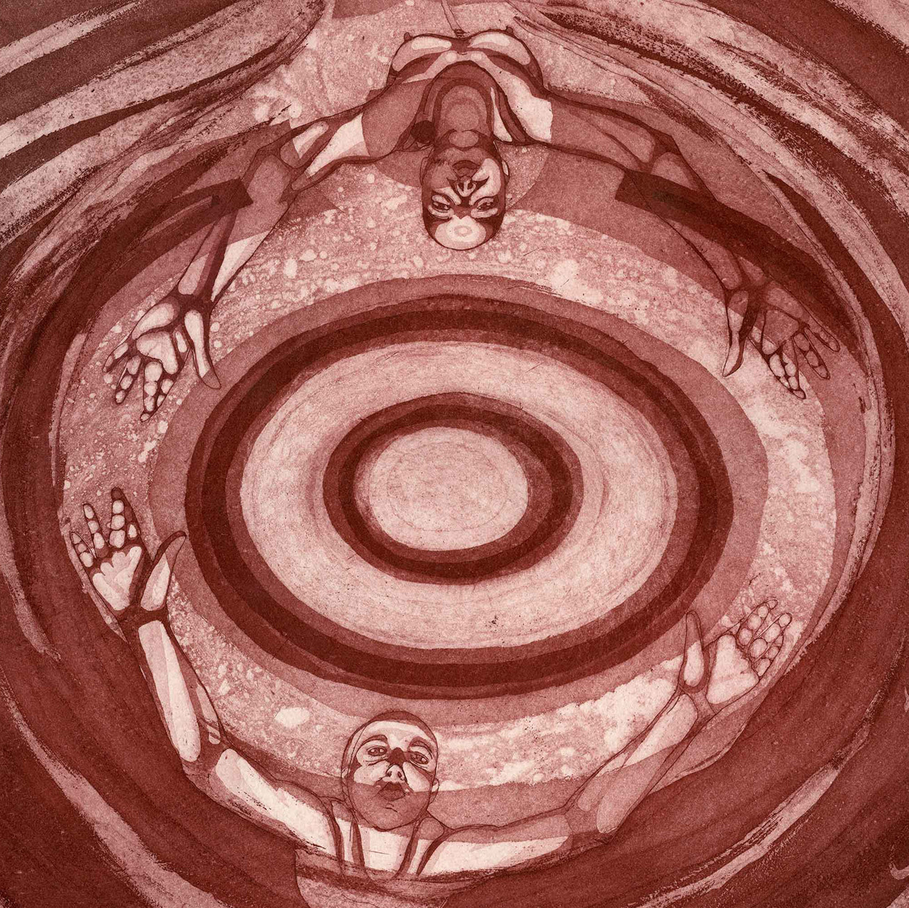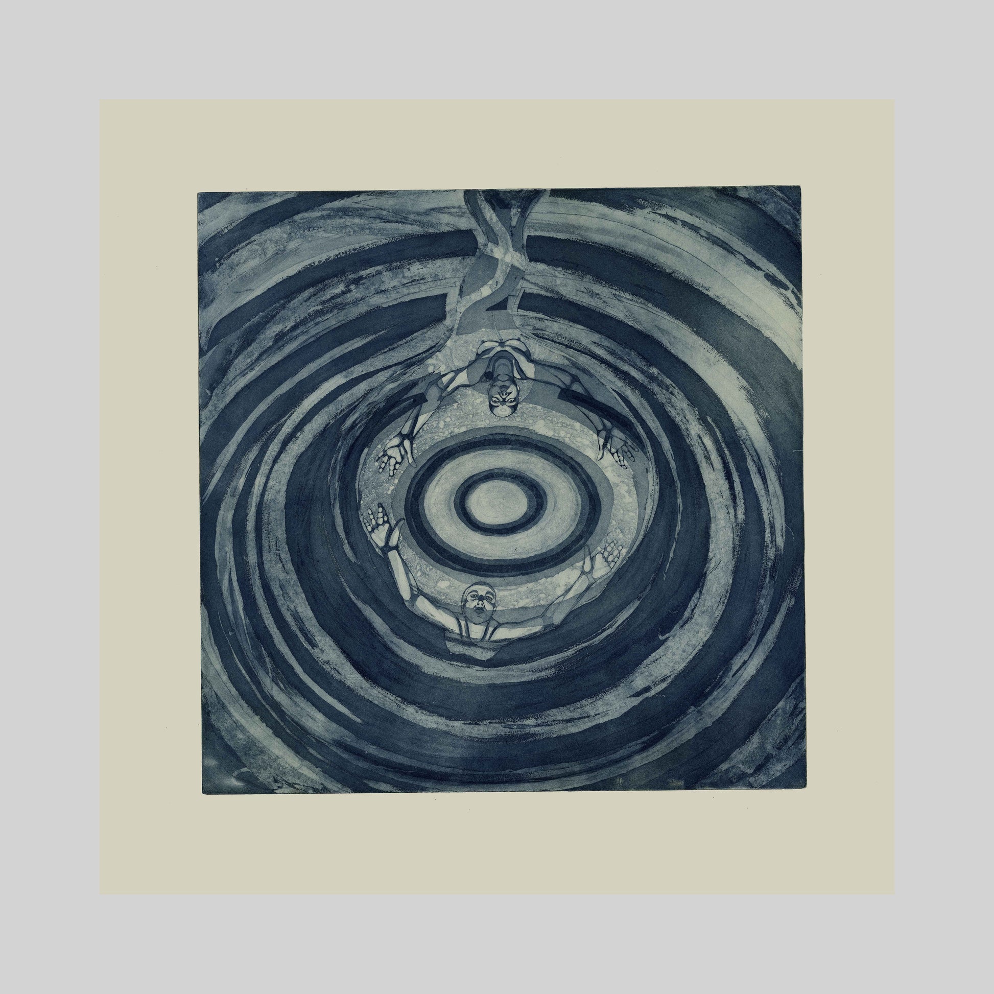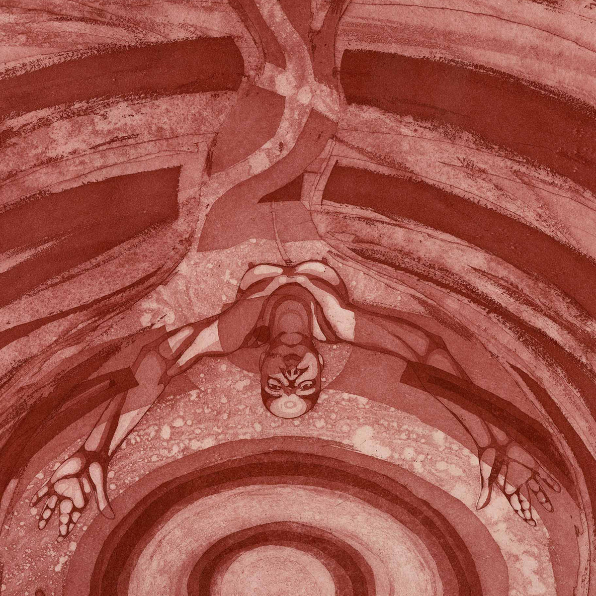 'Bigger than Me' is an etching, 50 × 50 cm. The original etching was printed in red and is available in an edition of five. The additional prints shown here are unique, one-off variations created through experimentation with colour and viscosity printing—a technique in which the viscosity of the inks is adjusted and layered so the colours remain distinct, creating depth and subtle texture.
