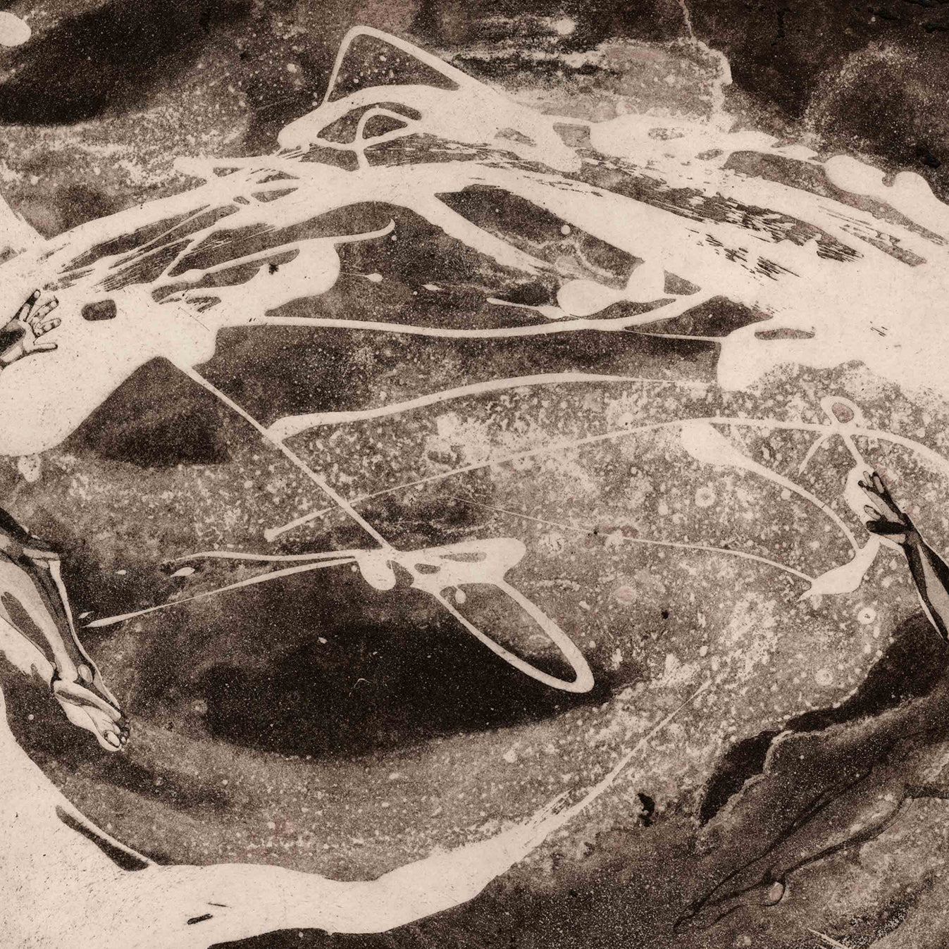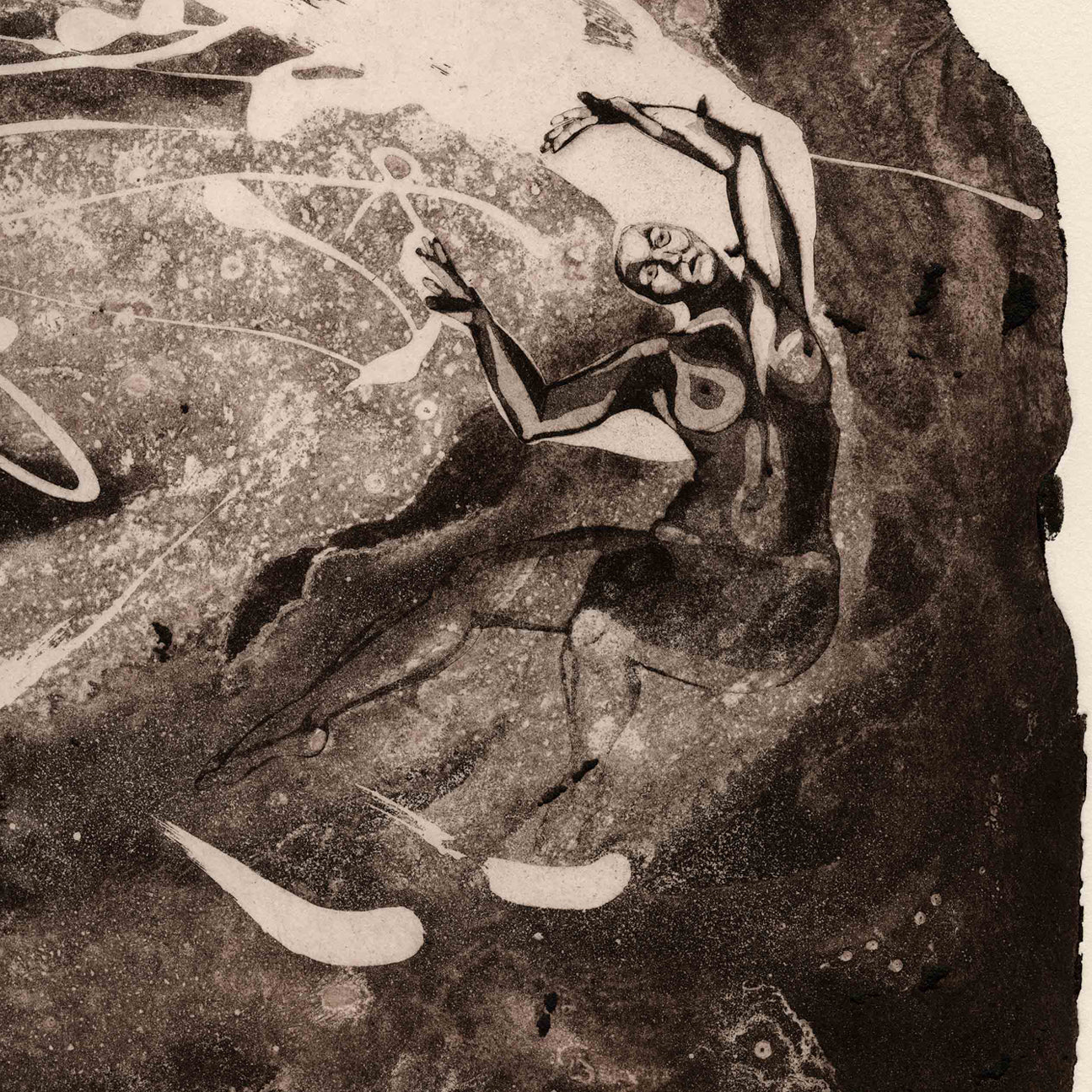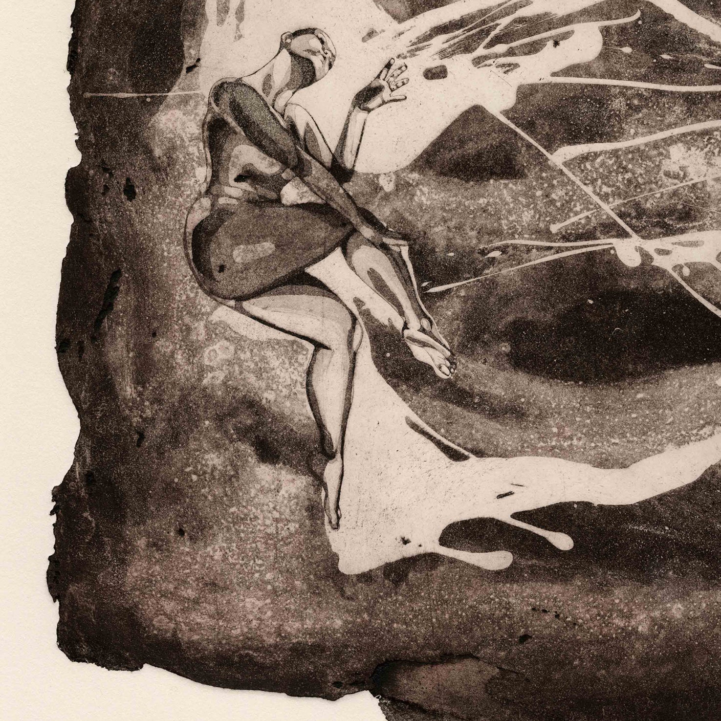 'Allegory of Us IV' is an etching, 44 × 33 cm, available in an edition of five, and is part of the Allegory of Us series, which consists of five images. Each piece in the series reveals a different narrative—a moment within the many forms of human connection, whether romantic, familial, or rooted in friendship. The metal plate for this piece was etched with acid to create an organic shape.