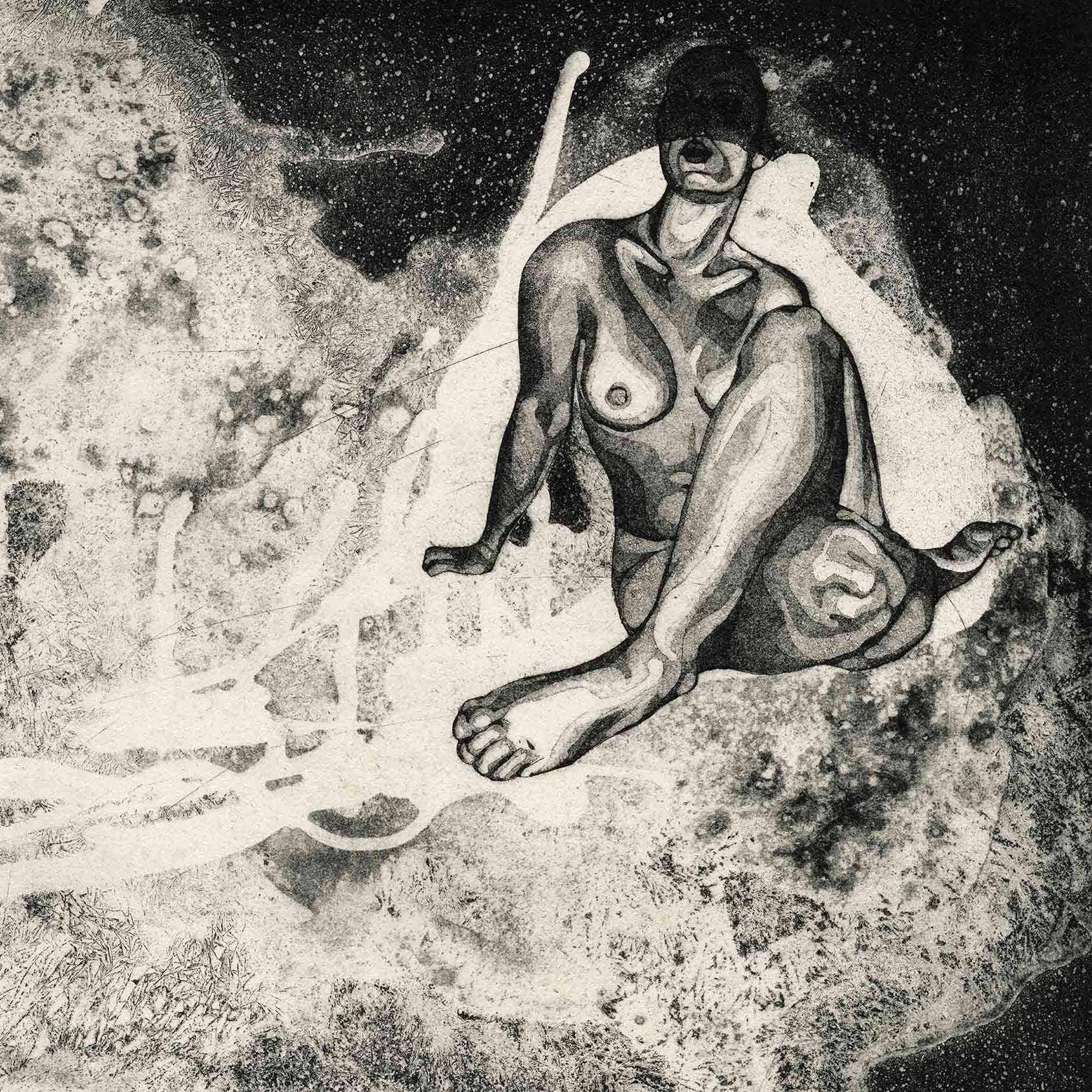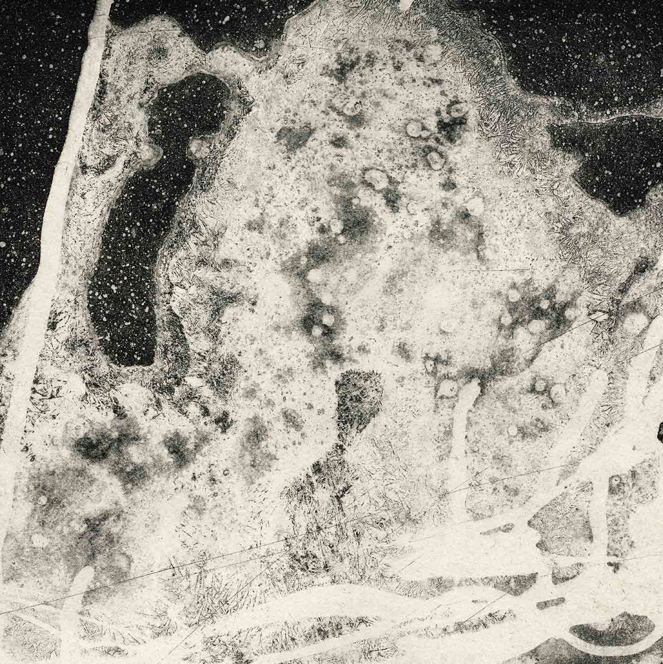 'Chronosynclastic infundibulum' is an etching, 48 x 35 cm, one off. Chronosynclastic Infundibulum takes its title from Kurt Vonnegut Jr.’s novel The Sirens of Titan. In the story, the term describes a cosmic phenomenon—“those places where all the different kinds of truths fit together.” When the character Winston Niles Rumfoord and his dog, Kazak, enter the chrono-synclastic infundibulum, they become wave phenomena that exist along a spiral stretching from the Sun to the star Betelgeuse. In this state, Rumfoord gains awareness of all past and future events and materializes periodically on different planets. Vonnegut uses this concept to explore fate, free will, interconnectedness, and the human search for meaning within a vast, indifferent universe.