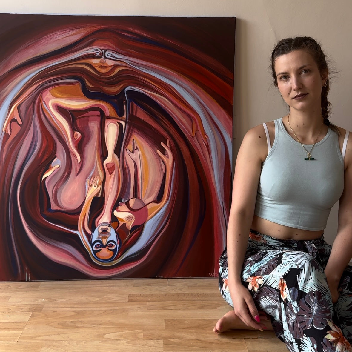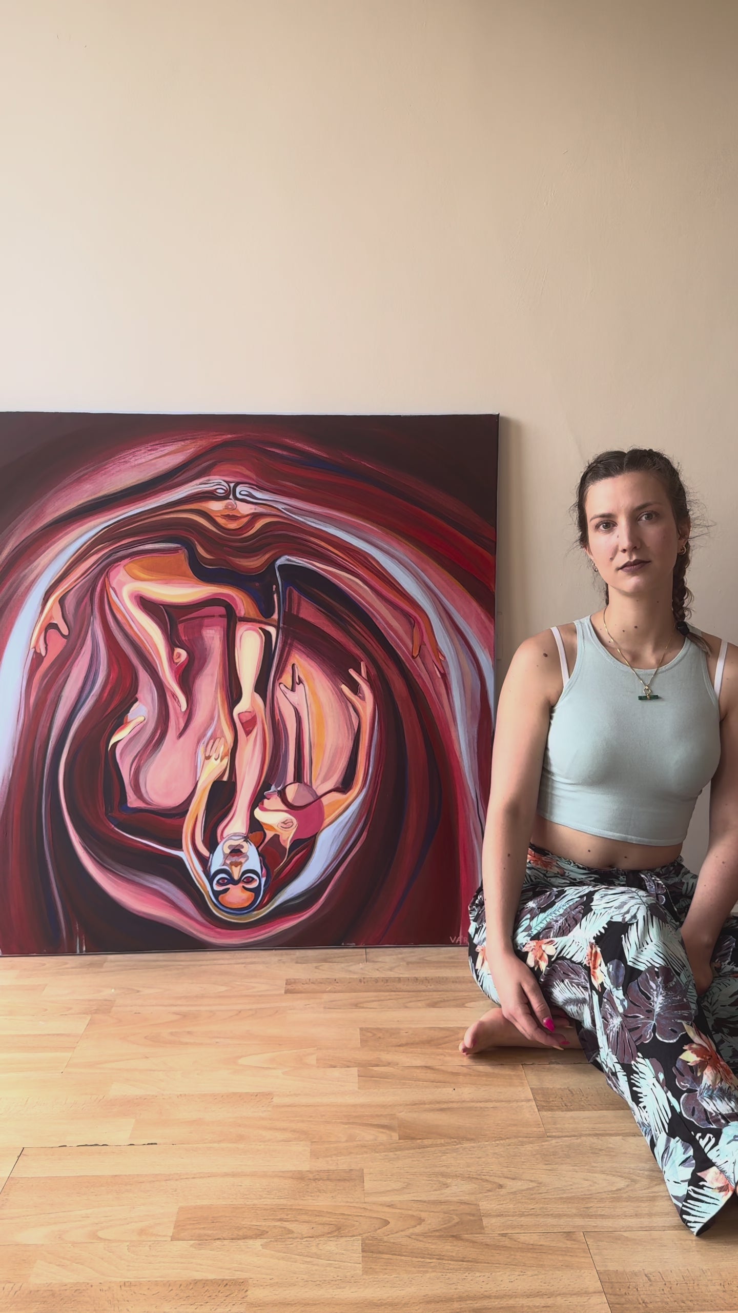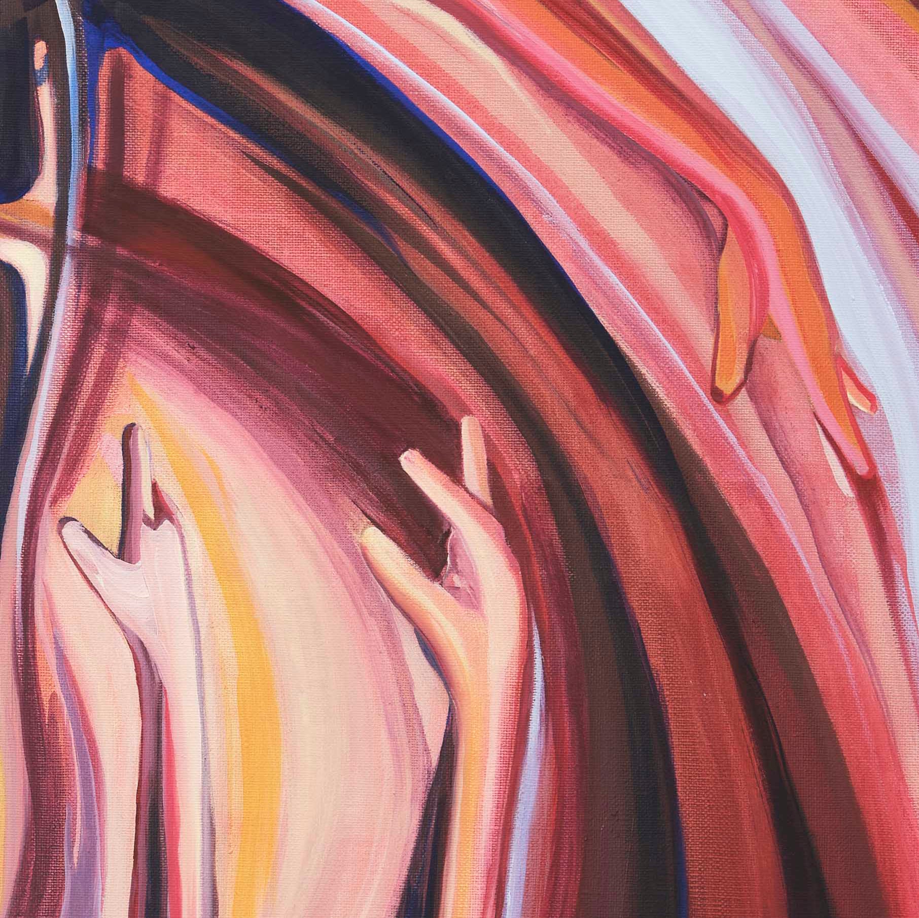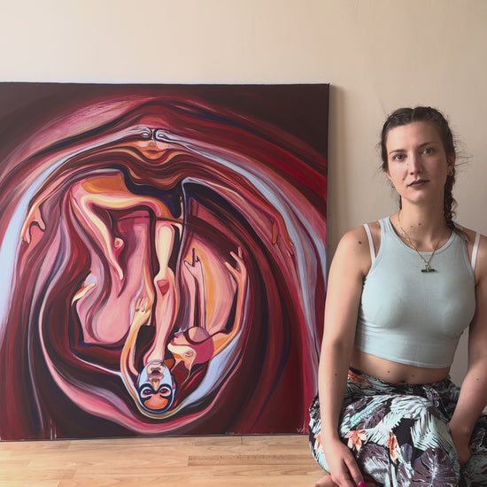 This oil painting, measuring 1 metre by 1 metre, is titled ‘Mushroom Lady’. It explores the complex power dynamics within relationships. While these can be nurturing and provide a sense of safety, they can also cause harm, often unintentionally. Just as a mushroom's cap can offer shelter, consuming it may be poisonous. Often, we fail to recognize how our actions impact others, clouded by the roles and labels we've assigned to one another.
