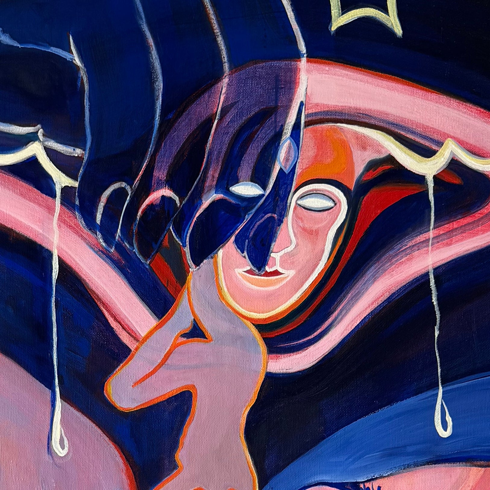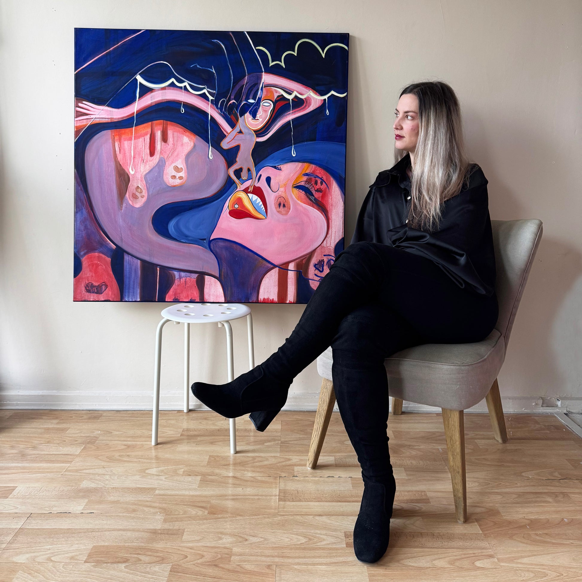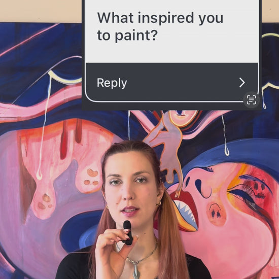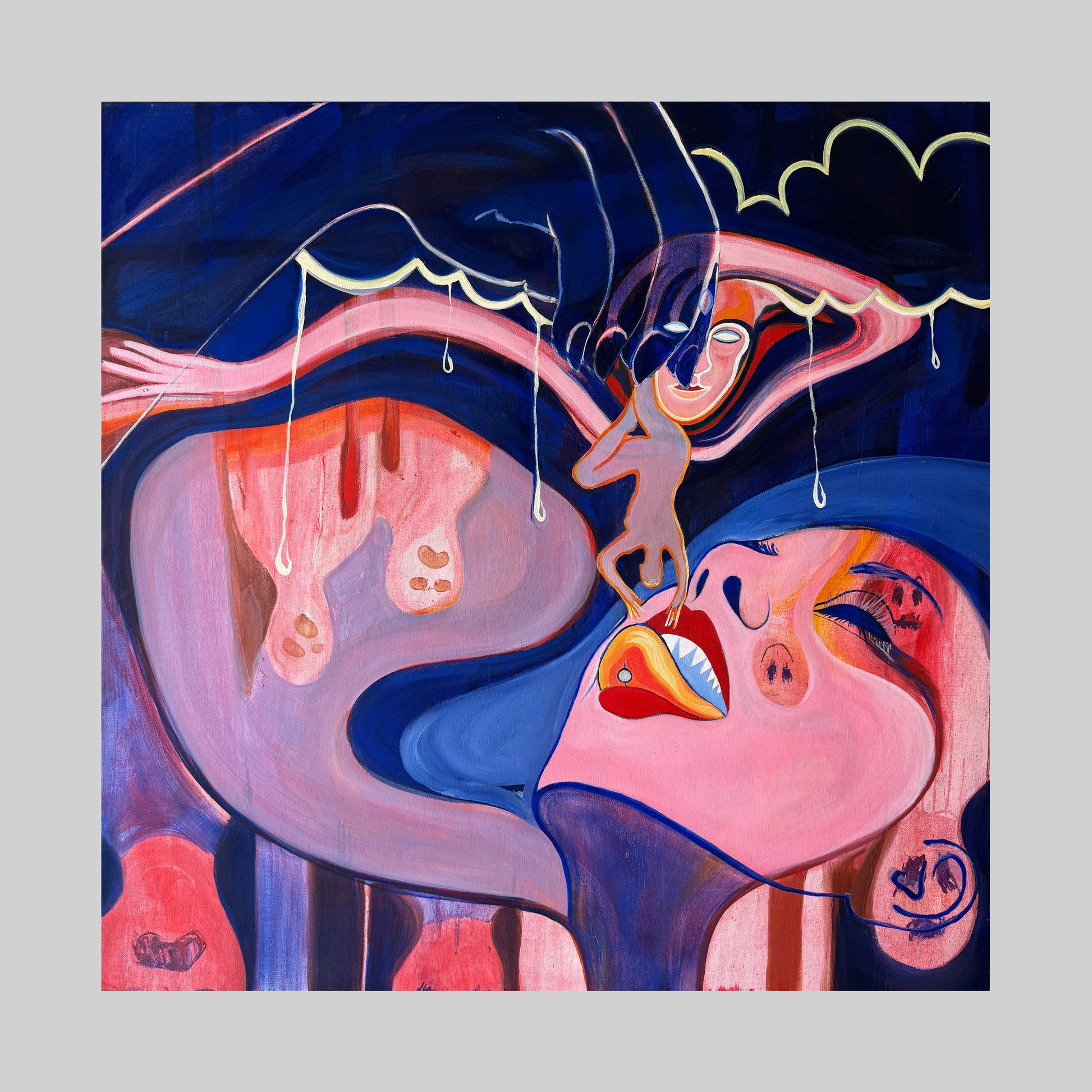 "Against the Current x Úgy Szeretlek, Majd Megeszlek" is a 1 metre by 1 metre oil painting that merges two ideas into one piece. It was initially conceived to explore the question: when, if ever, should we give up going against the current? If everyone holds a different point of view, are you right? It’s possible that you are the only one seeing the light that no one else does — but how do you know if you aren’t wrong?