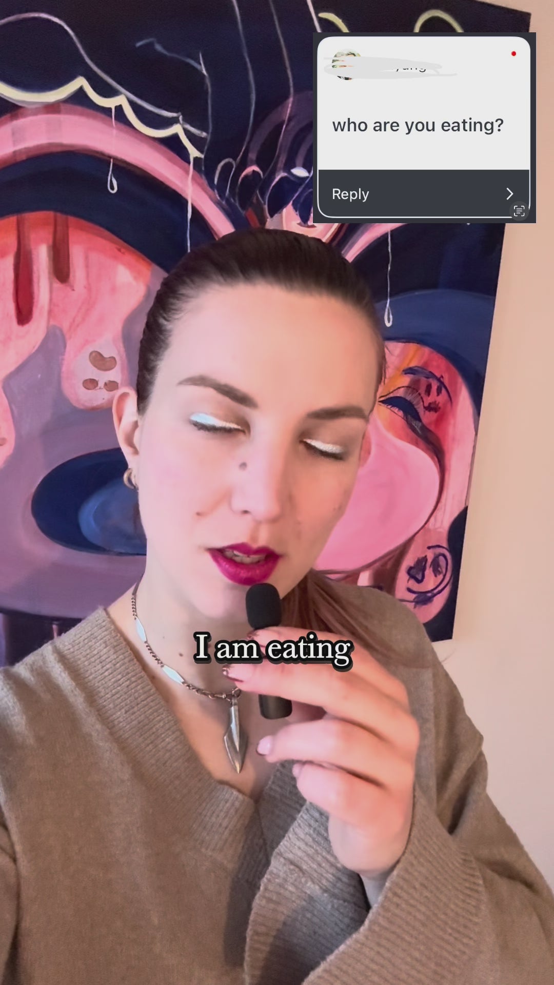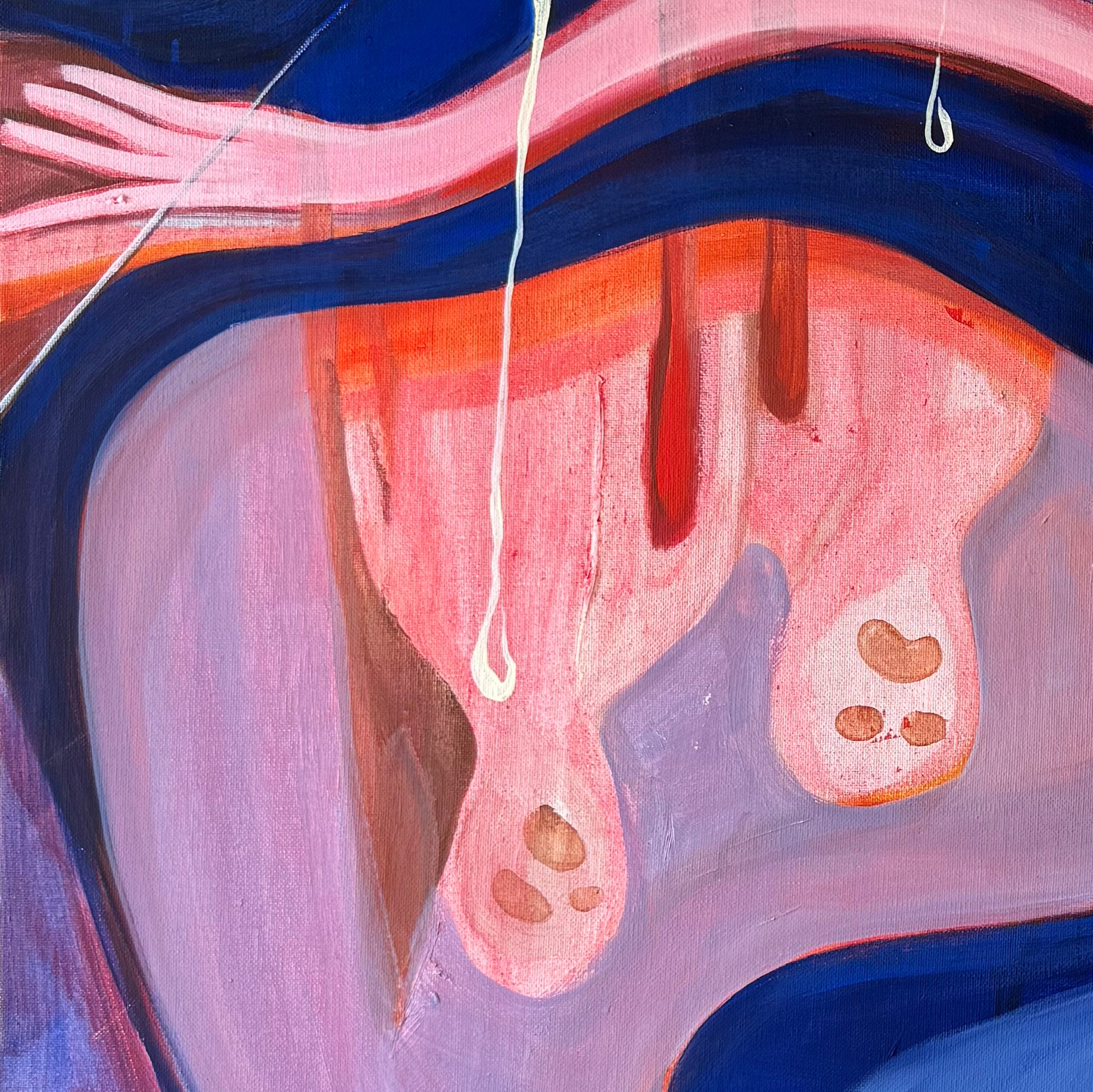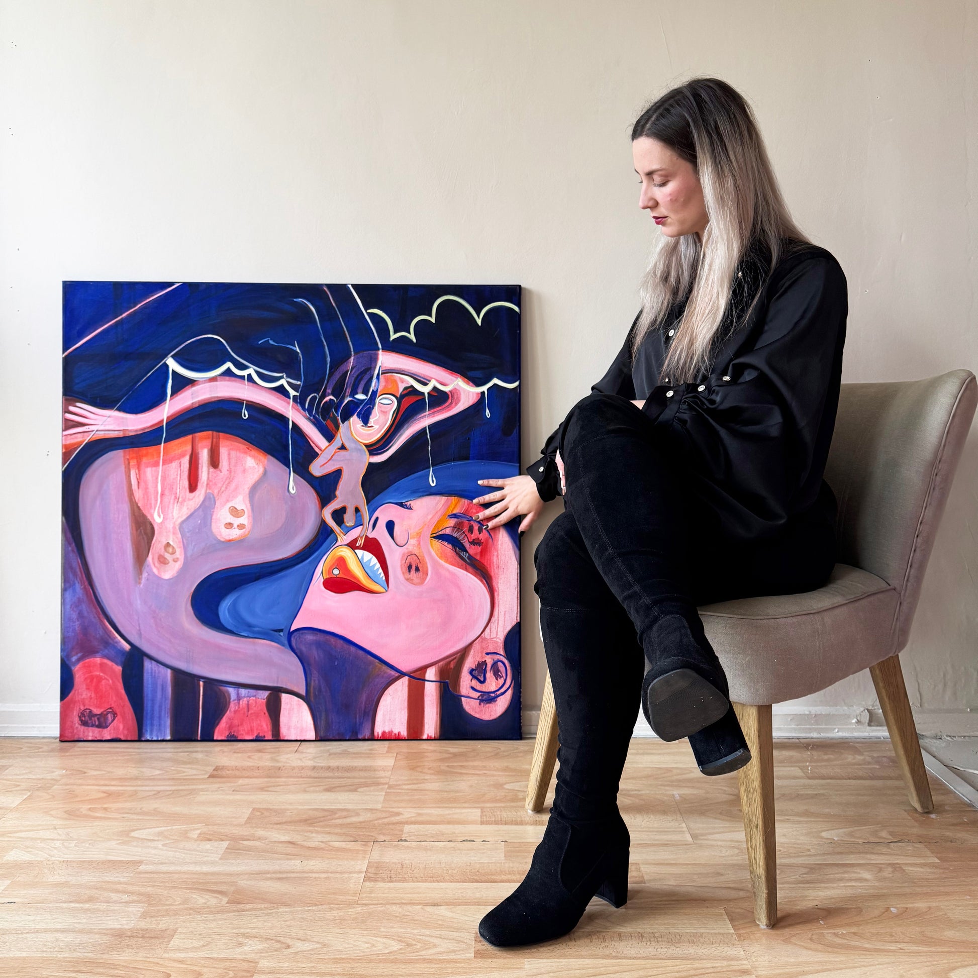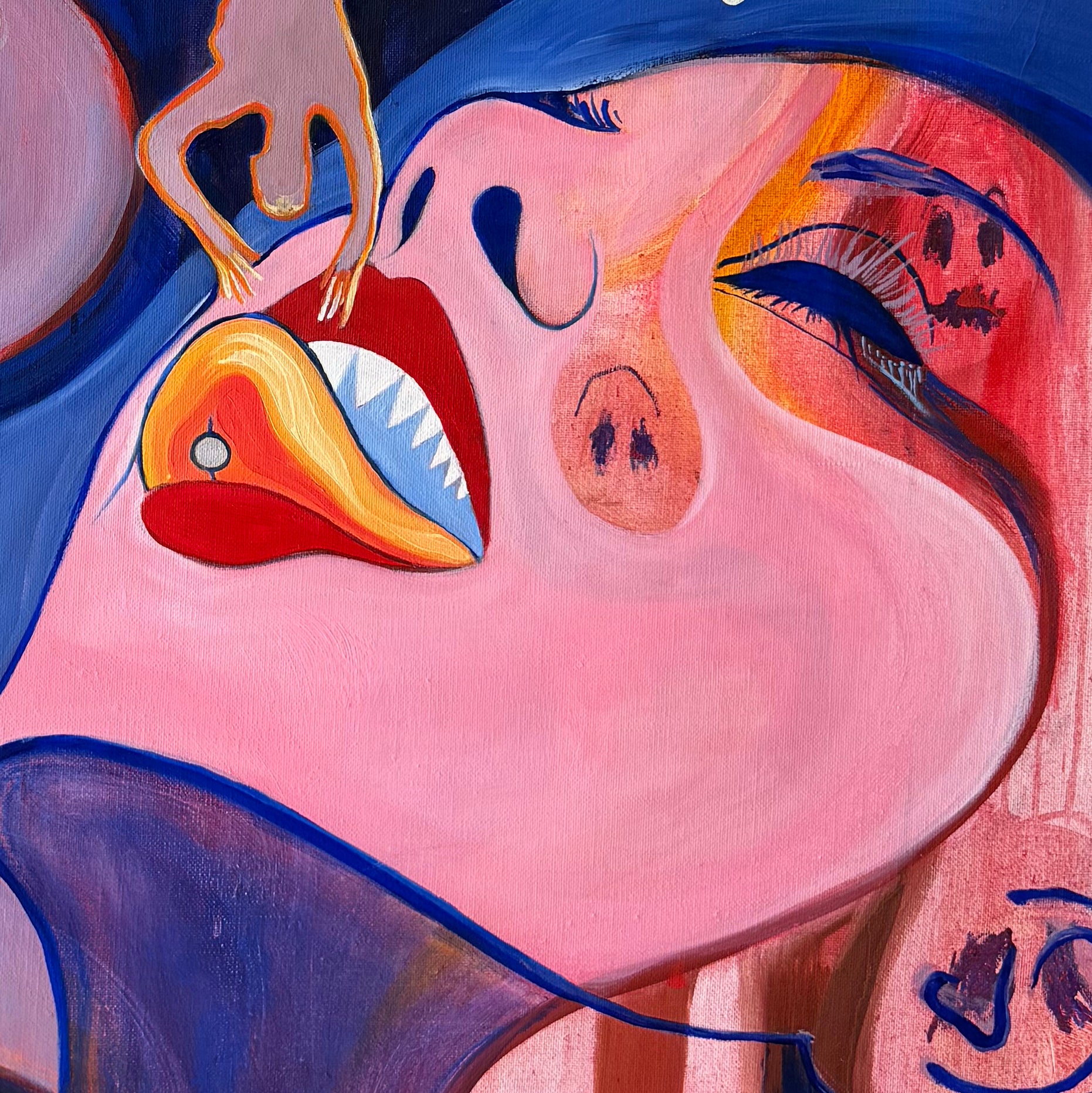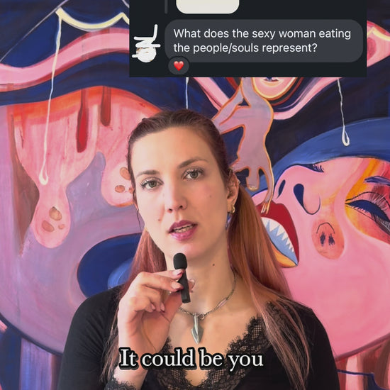 As I worked on the painting, another concept began to take shape, inspired by the Hungarian saying "Úgy szeretlek, majd megeszlek," which translates to "I love you so much, I could eat you." This phrase is commonly used by adults towards children in Hungary, and it was something I heard often as a child. I found it intriguing that this expression could imply a desire to consume those we love, potentially diminishing them. Unfortunately, it’s not uncommon to see people expressing love in ways that unintentionally drain or harm others. This led me to consider the importance of breaking this pattern—going against the current, so to speak—by shining a light on it.
