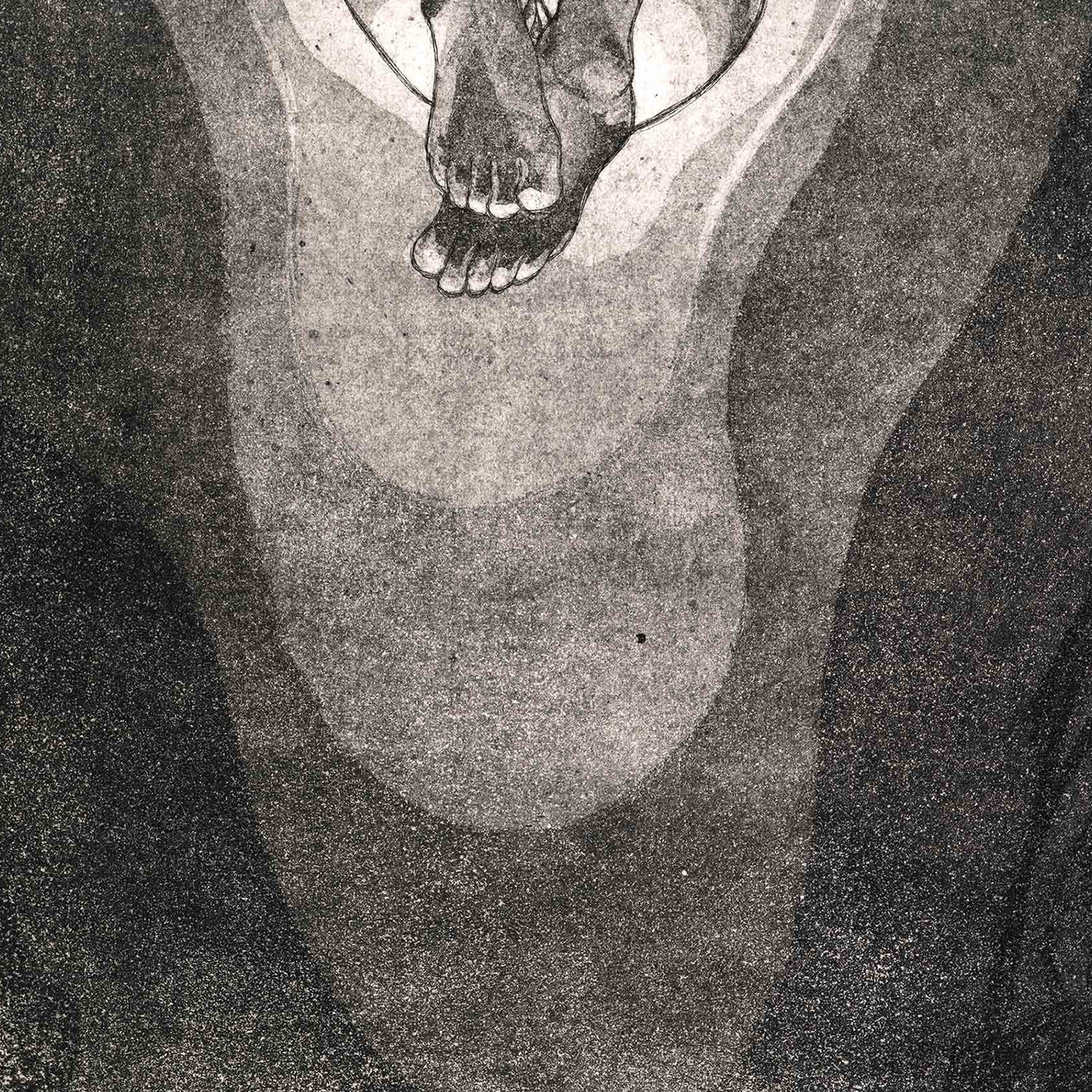 'Void' is an etching, 59.4 × 42 cm, available in an edition of five. It depicts a woman floating in the midst of darkness, radiating her own light. She has faced the void, mastered it, and is now ready to share her inner brilliance with the world. Though she appears alone and curled up, she glows with quiet confidence and strength.